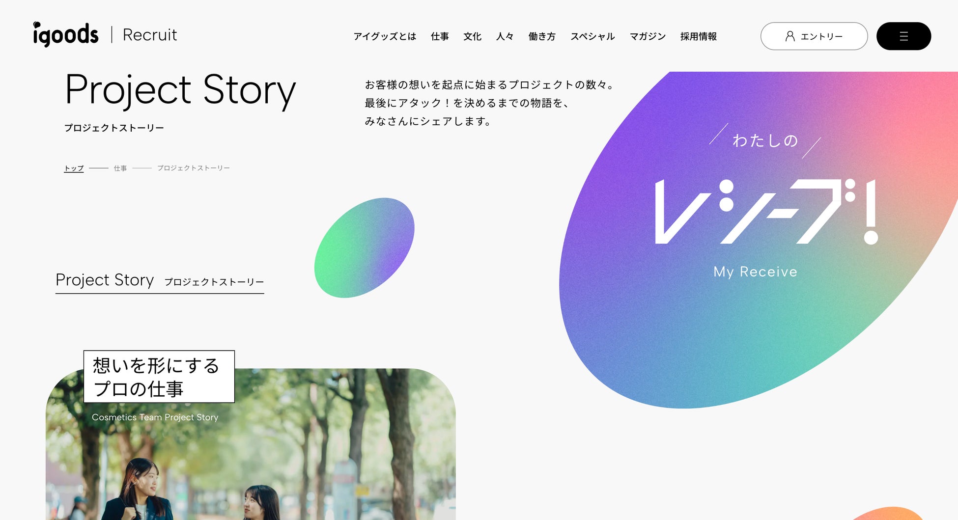 「わたしのレシーブ!」と題し、お客様や仲間の想いを受け止め、どうかたちにしていくのかのプロセスを描いた仕事ドキュメント。成功の裏にある葛藤や挑戦も包み隠さず描いています。