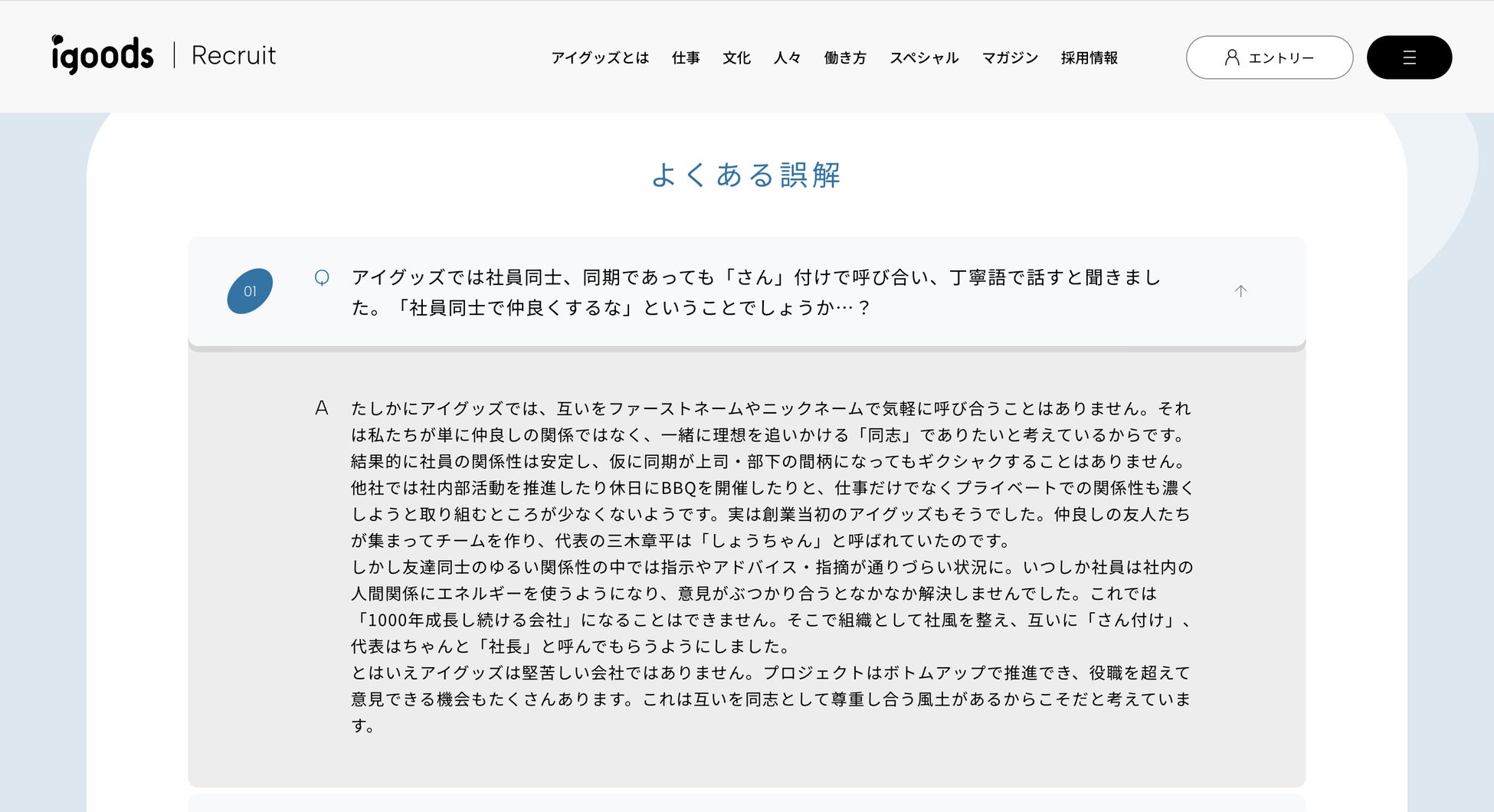 「世界一詳しいFAQを作ろう」と社内で作り込みを行った結果、当ページだけで総文字数は5万字超えに。なんだか言語化できない当社への疑問をこのページで一掃できれば、という考えのもと、就活生が実は聞けていないであろう企業文化や制度、考え方について深堀しました。当社をさらに奥深くまで知っていただけるコンテンツです。
