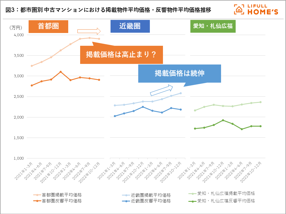 2022年10~12月期の中古マンション掲載物件平均価格は、近畿圏で2,574万円(前期比102.5%・前年比108.3%)、愛知・札仙広福(※6)で2,365万円(前期比100.9%・前年比104.2%)となり、いずれも前年と比べ上昇しています。首都圏(※7)は3,908万円(前期比99.4%・前年比107.9%)と、前期と比べ下落に転じました。