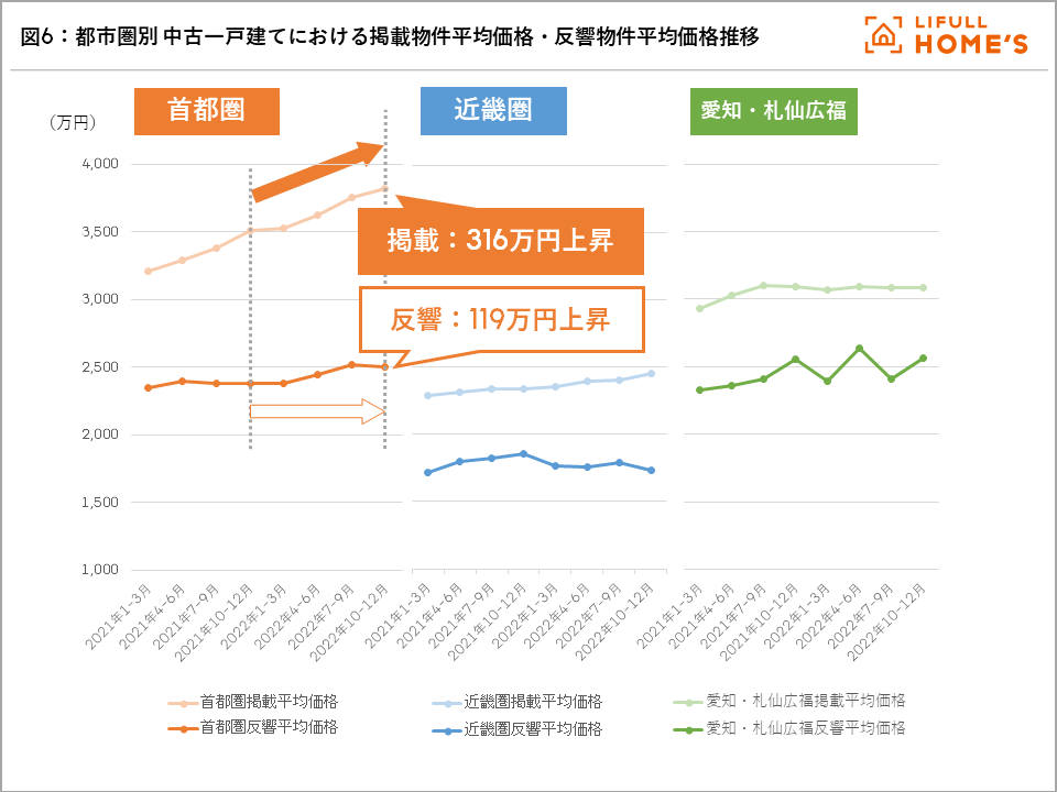 - 首都圏の中古一戸建ては、掲載価格の上昇が続くも、反響価格との乖離は拡大