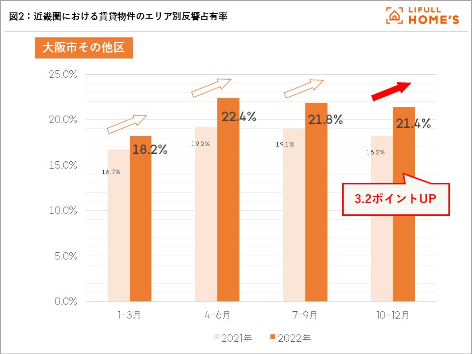 2022年10~12月期の近畿圏(※4)の賃貸市場における反響物件のうち、「大阪市その他区」(※5)の物件が占める割合は21.4%となり、前年の18.2%から3.2ポイント増加し、2022年は全四半期において前年同期を上回りました。(図2参照)同エリアの近畿圏における掲載占有率も前年比2.0ポイント増加していますが、それ以上に反響占有率の増加が上回っていることから、「大阪市その他区」の賃貸ニーズが増加傾向にあることが分かります。
