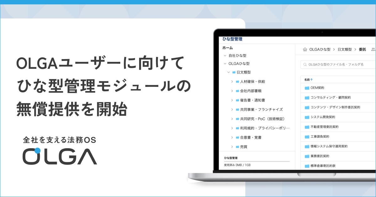 GVA TECH株式会社(本社:東京都渋谷区、代表取締役:山本 俊、以下GVA TECH)は、全社を支える法務OS「OLGA」の全てのユーザーに対して、ひな型管理モジュールの無償提供を開始いたします。