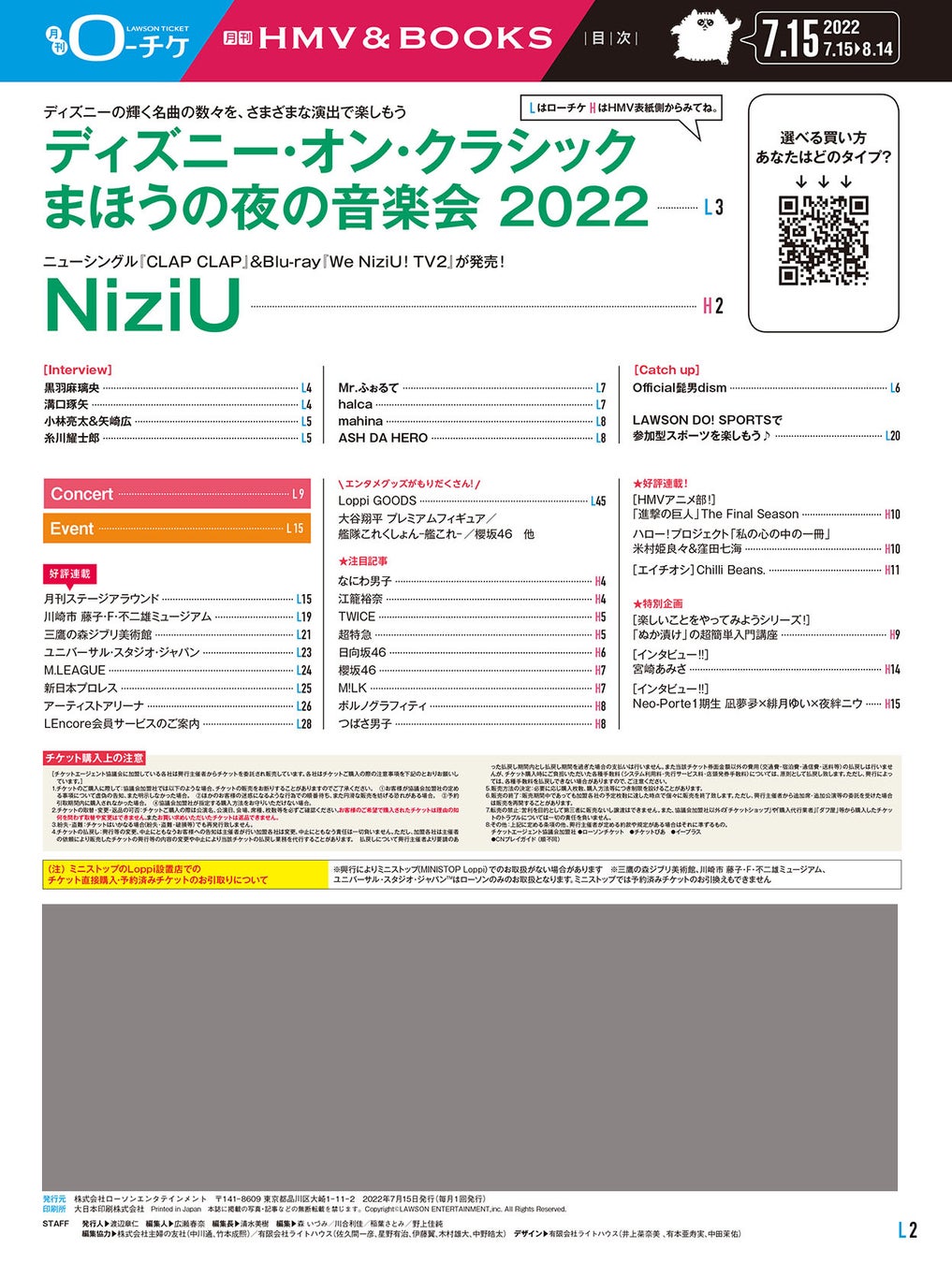 株式会社ローソンエンタテインメント(本社:東京都品川区、代表取締役社長:渡辺 章仁)が運営する「ローソンチケット」および「HMV&BOOKS」は、フリーペーパー『月刊ローチケ/月刊HMV&BOOKS』2022.7.15号を、7月15日(金)より、全国のローソンやHMVなどの店頭にて順次配布いたします。