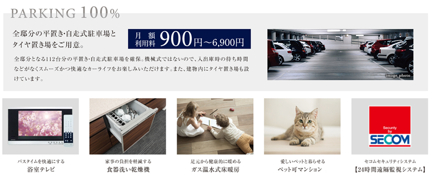 駐車場 : 112台(自走式:89台 屋外平置き:16台 屋内平置き:7台※車いす使用者優先:1台含む)