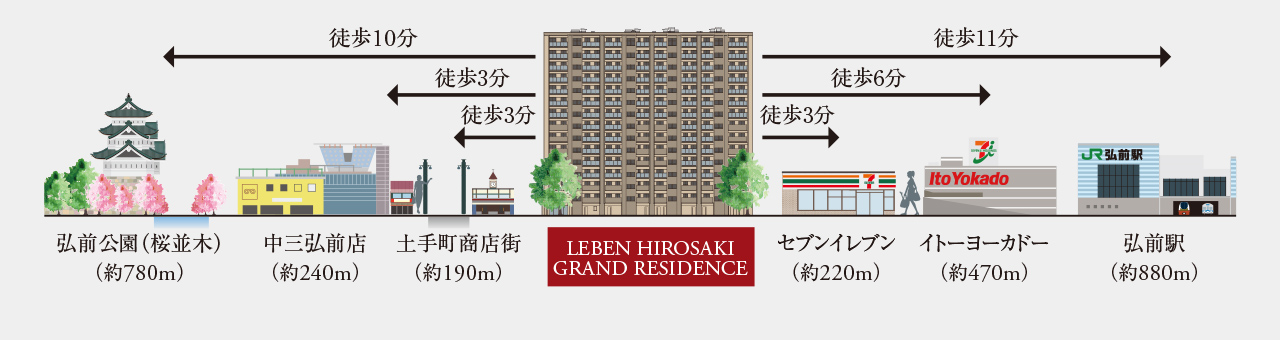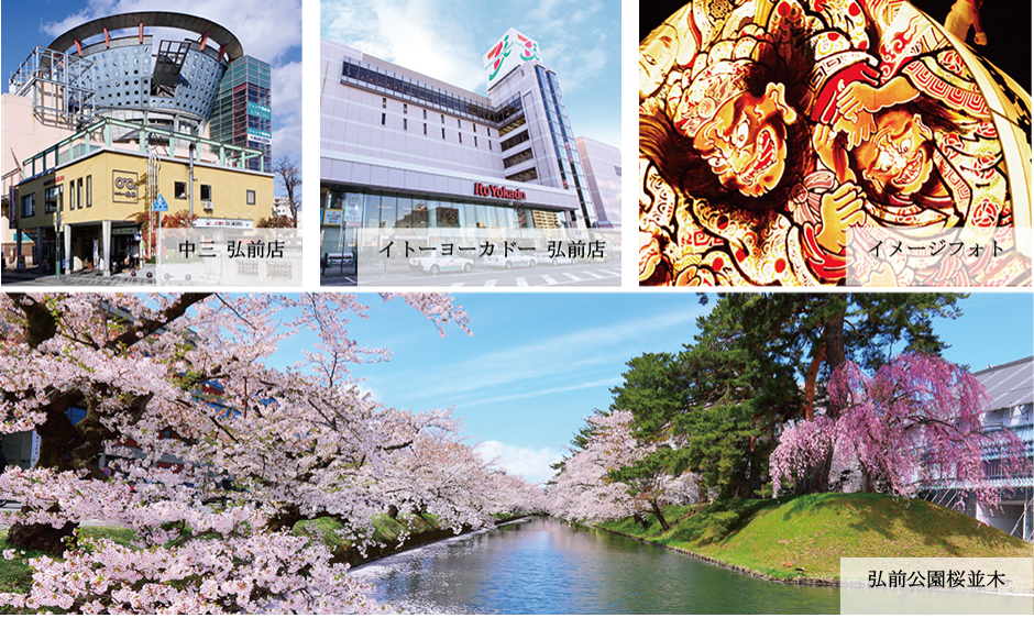 中三やイトーヨーカドーなどの日常利便施設を徒歩圏にしながら、夏の風物詩「弘前ねぷた」コースを眼下に備え、「弘前公園」、「弘前城」が気軽な散策エリアに。