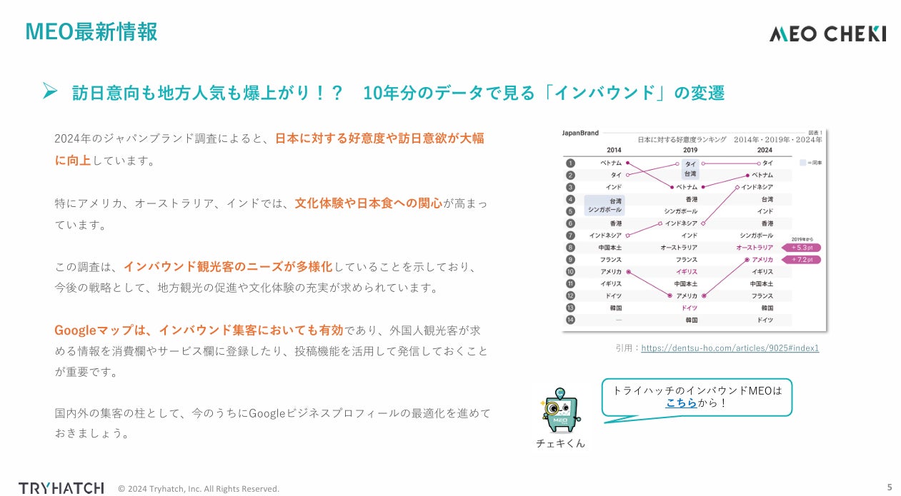 2024年9月の最新情報では、「訪日外国人観光客の変遷」や「Googleビジネスプロフィールのポリシー違反」などについて掲載。