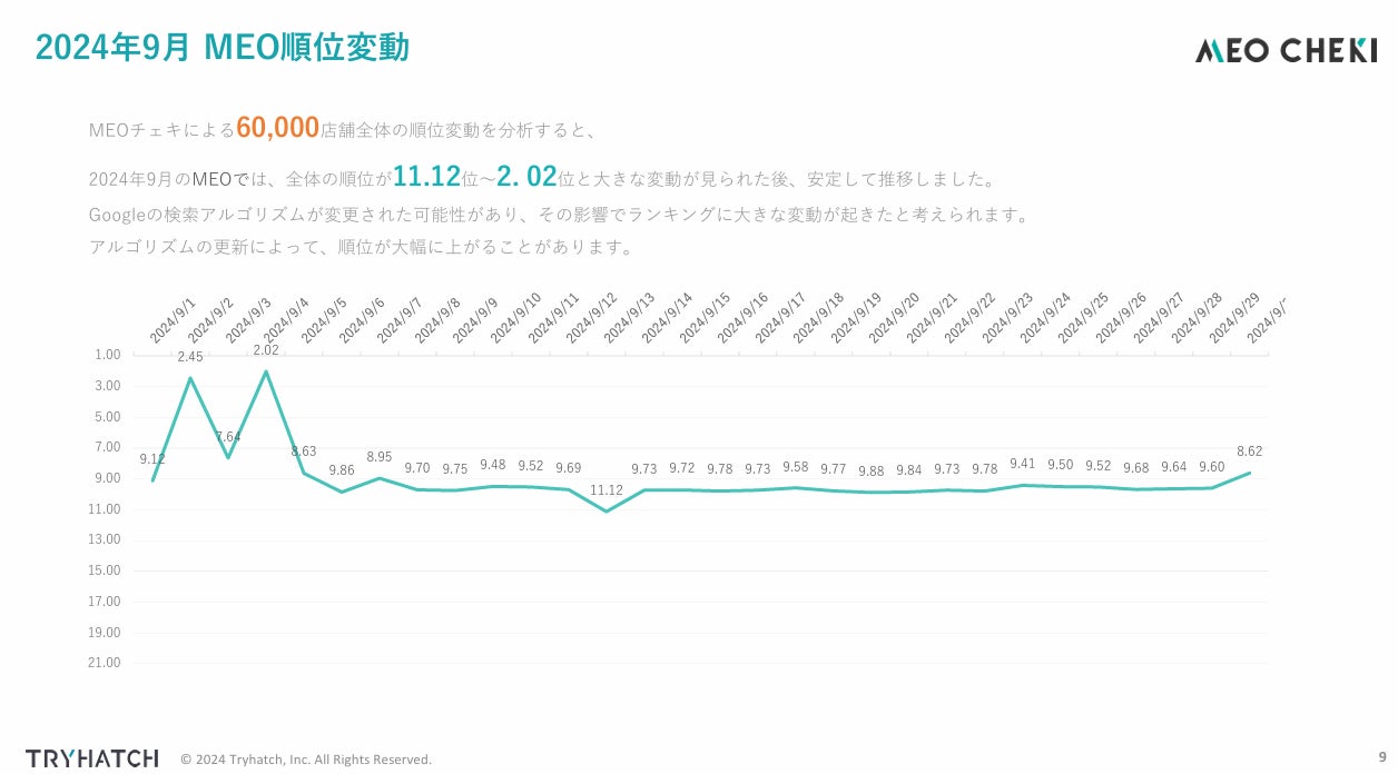 2024年9月のMEOでは、全体の順位が11.12位〜2.02位と大きな変動が見られた後、安定して推移しました。