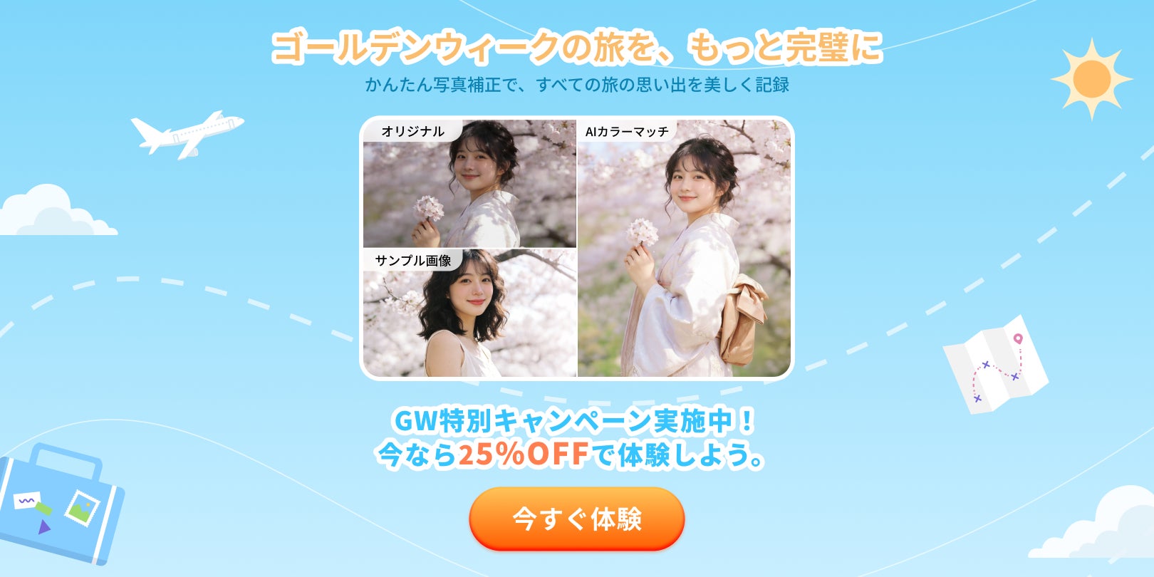 そんな悩みを解決するのが、AI搭載の美肌加工アプリ「PixPretty」です。最新バージョンでは、新機能「AIカラーマッチ」を搭載し、誰でも簡単に“理想の色味”を再現できるようになりました。現在、ゴールデンウィーク限定で全商品25%OFFキャンペーンを開催中! 旅行写真をもっと魅力的に仕上げたい方にとって、見逃せないチャンスです。