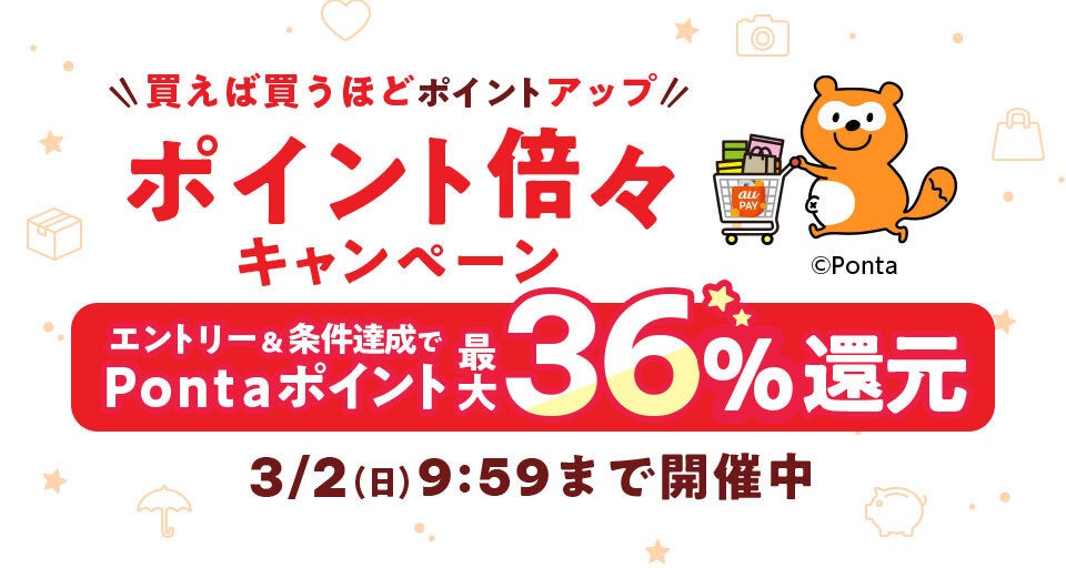 期間中に下記①~③をすべて満たすお客さま ①「au PAY マーケット」で会員登録、またはログインをいただくこと ②キャンペーンページからエントリーしてクーポンを取得いただくこと ③期間中、1商品につき商品単価1,000円(税込)以上の商品をご購入いただくこと ※ポイント上限は、2,000ポイントとなります。 ※還元ポイントは、Pontaポイント(au PAY マーケット限定)となります。 ※1商品目、2商品目、3商品目、4商品目、5商品目は、それぞれ異なる商品の購入が必要です。 |