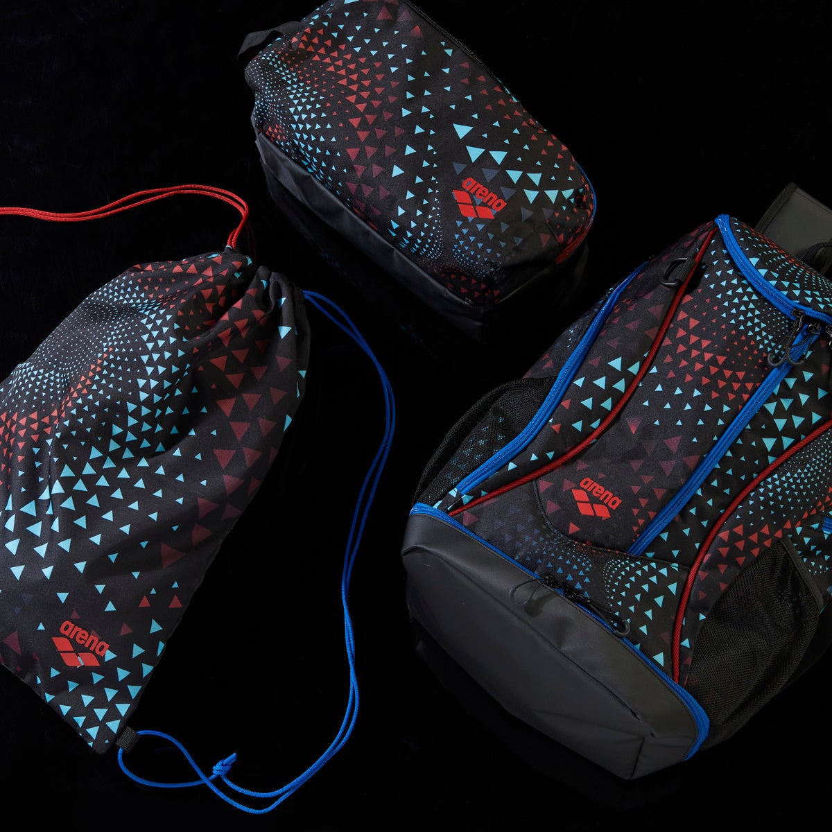 「ARENA FIREFLOW」デザインは、「選手がレースに挑むときに必要なこと」をコンセプトにしています。勝利には身体的な強さだけではなく不屈な精神が重要で、その道のりの中で選手たちが経験する心理状態をデザインで表現しました。火は情熱や競争心が心の奥で燃え上がり立ち向かう力、水は落ち着いて集中力を高め自分をコントロールする力。この真逆な二つの要素が交わった時に大きな力を発揮することをイメージし、赤と青の逆向きの三角形で表現したデザインになっています。