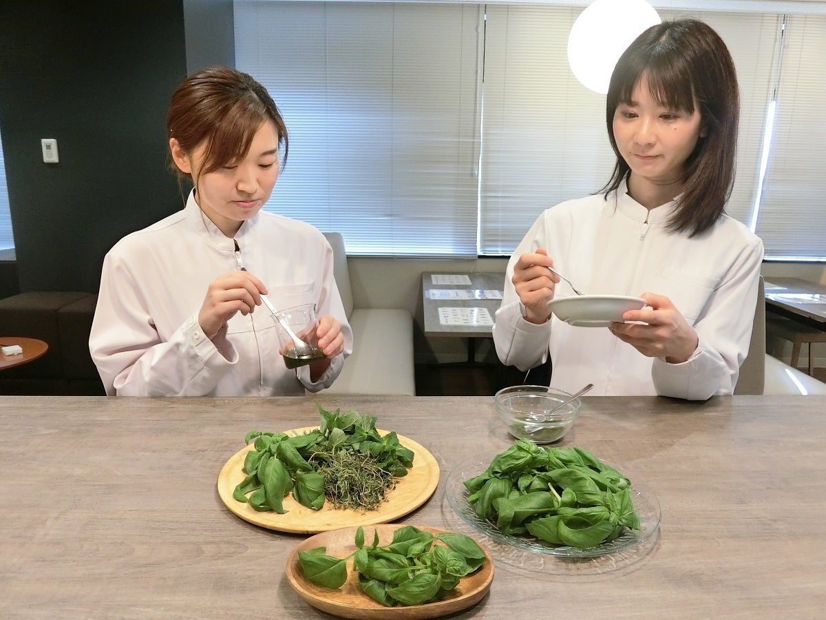 着想のきっかけは、市場調査&試食にでかけた際に立ち寄ったお店で飲んだ“一杯のハーブティー”でした。「バジルもハーブの一種、バジルのお茶ができたら面白いかも、そういえば煎茶はお茶の香り高い特徴をもちつつ保存がきく、この考えはバジルに応用できるかも!」そこからバジルの加工に日本茶の製法を取り入れる試みがスタート。実際に京都や静岡に行き、お茶作りを体験したり、お茶工場を見学しました。お茶の素晴らしい風味がどう形成されていくのか、またお茶作りの丁寧さ・こだわりに触れたことは、この後の開発に非常に影響を与えました。