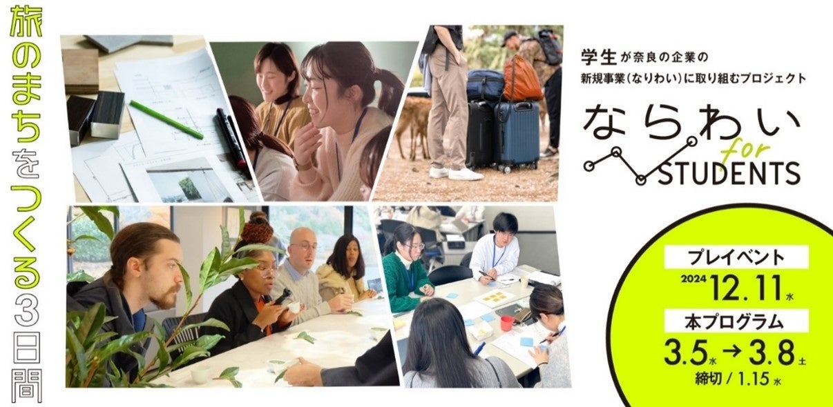 若者世代の活躍を応援する奈良市では、学生が奈良の企業の新規事業(なりわい)に挑戦する短期集中プログラム「ならわい for students ~旅のまちをつくる3日間~」を実施します。このプログラムは、「起業したい」「地域と関わりたい」「奈良をもっと面白くしたい」そんな学生の中にある想いを形にする、3日間のプログラムです。各企業からのお題に対して、学生が5人一組のチームを組み、3日間で新たな企画を提案します。3月の本プログラム開催にあたって、12月11日(水)に募集説明会を兼ねたプレイベントを実施します。