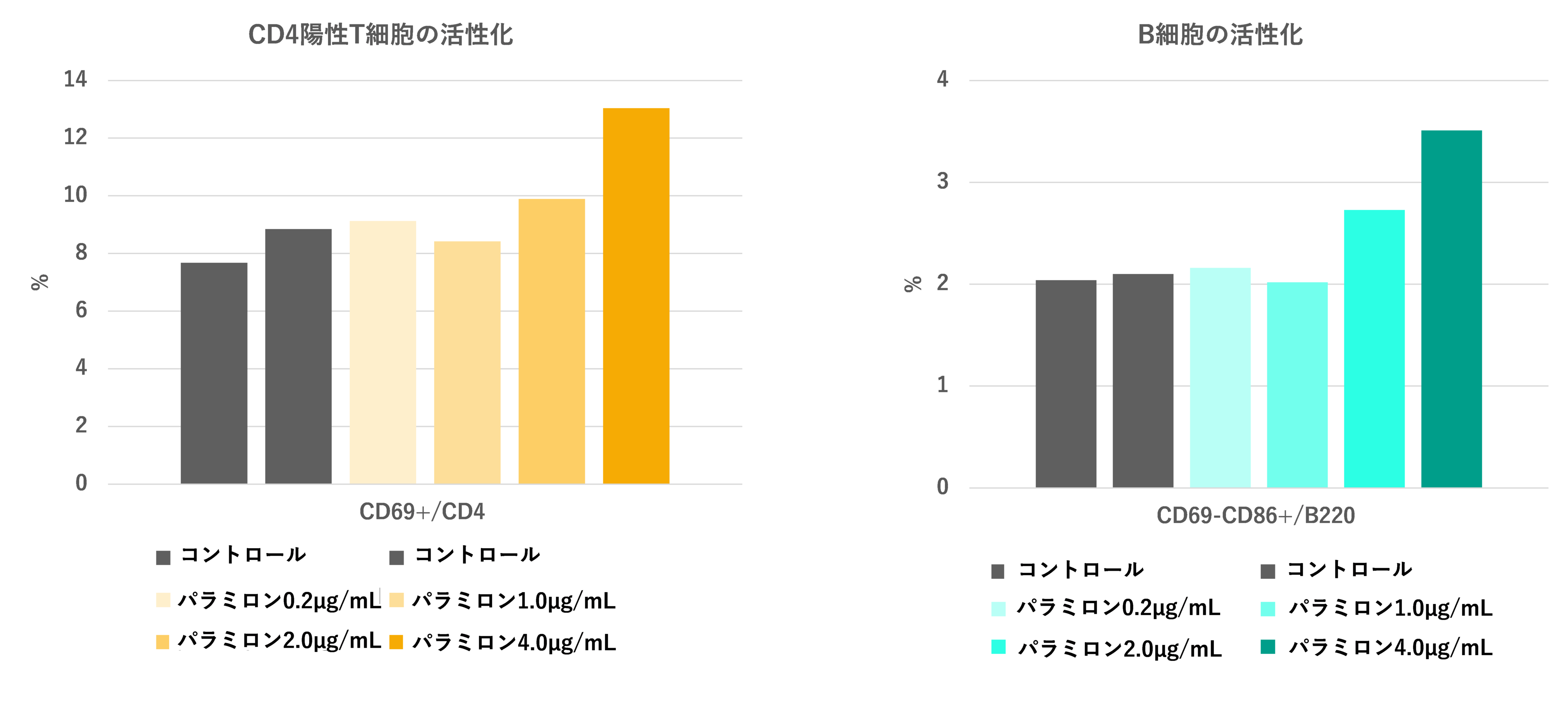 マウス由来脾臓細胞へのパラミロンの添加により、パラミロンが濃度依存的にT細胞やB細胞を活性化することが確認されました。