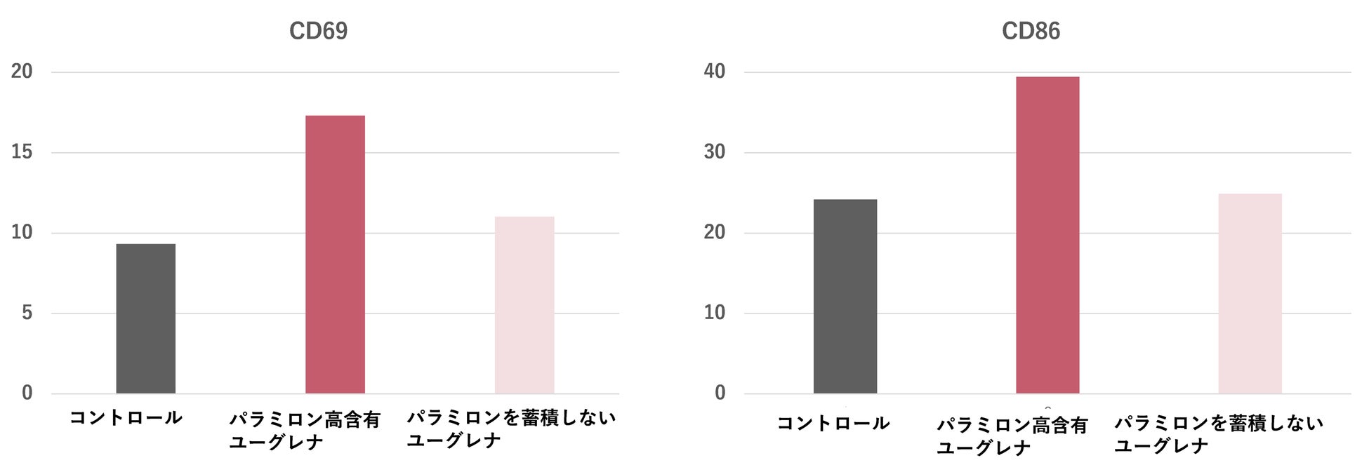 前述の通り、ユーグレナ社ではこれまで、ユーグレナの免疫への関与が、主にパラミロンの寄与によってなされることを様々な角度から検証・確認してきました。その結果をさらに新たな角度から検証するために、ゲノム編集技術を活用して、「パラミロンを蓄積しないユーグレナ」を作出し、T細胞やB細胞の活性化を指標として、免疫系への関与を確認しました。具体的には、マウス脾臓由来細胞へ、「パラミロンを蓄積しないユーグレナ」、「パラミロン高含有ユーグレナ」をそれぞれ添加し、次世代シーケンサーを用いて、48時間培養後の細胞の遺伝子発現を解析しました。その結果、T細胞の活性化マーカーであるCD69とB細胞の活性化マーカーであるCD86の遺伝子発現において、「パラミロン高含有ユーグレナ」では、サンプルを何も添加していないコントロール(対照)と比較して発現が高くなりましたが、「パラミロンを蓄積しないユーグレナ」では、その発現に変化が見られませんでした(図2)。