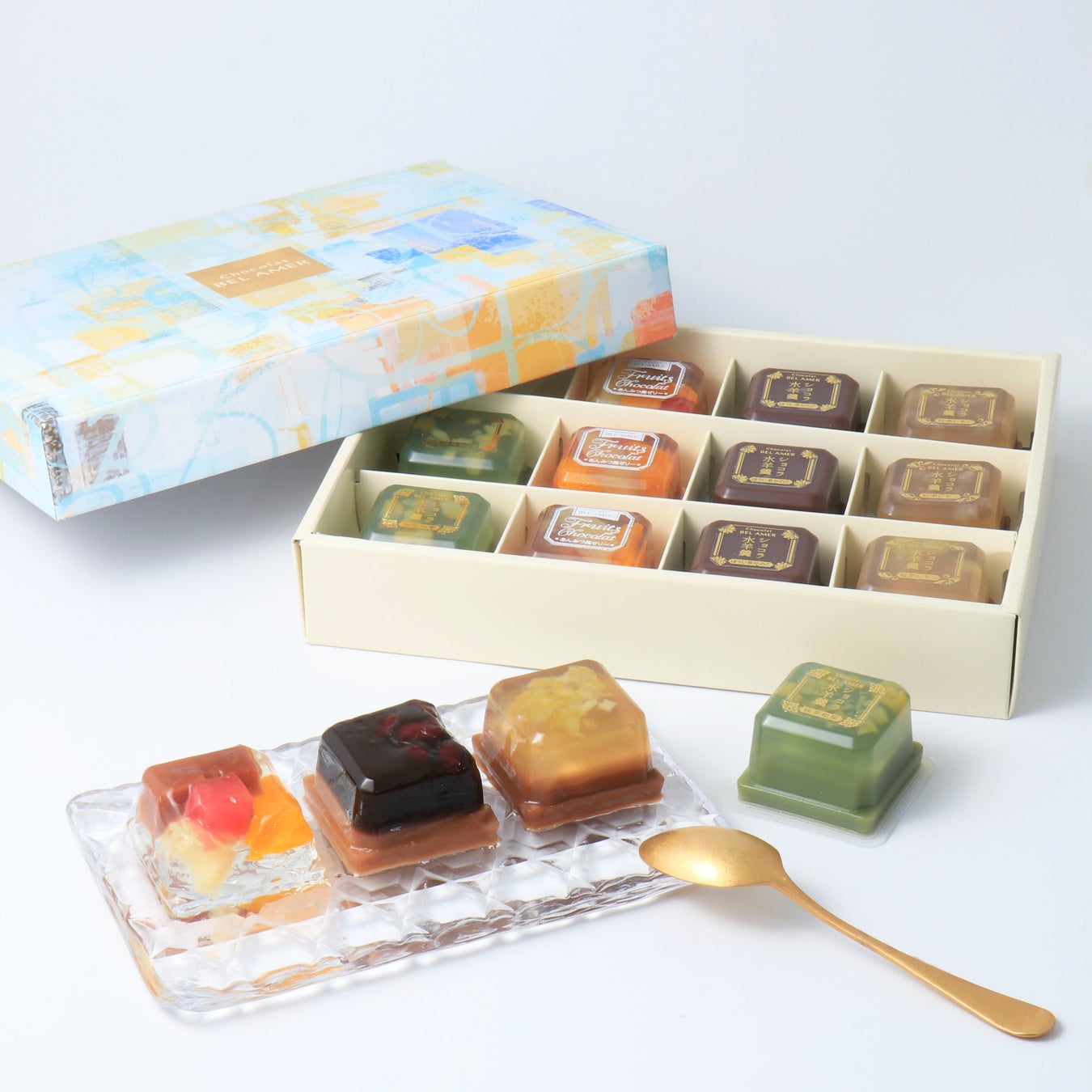 抹茶和栗、ほうじ茶かのこ、紅茶レモンの3種のショコラ水羊羹と、あんみつをイメージしてフルーツや寒天を閉じ込めた涼やかなあんみつゼリーの4種をご用意しました。
