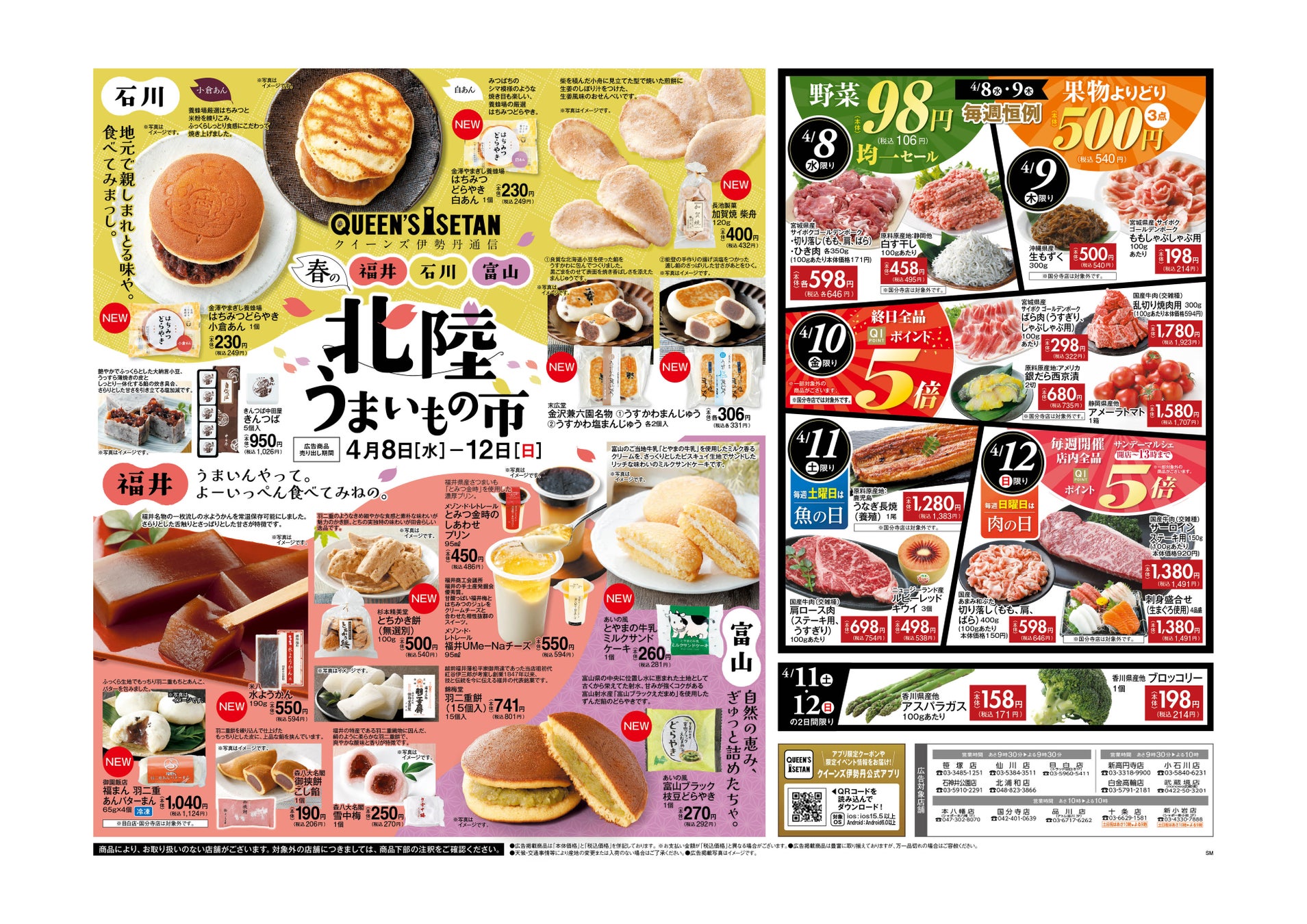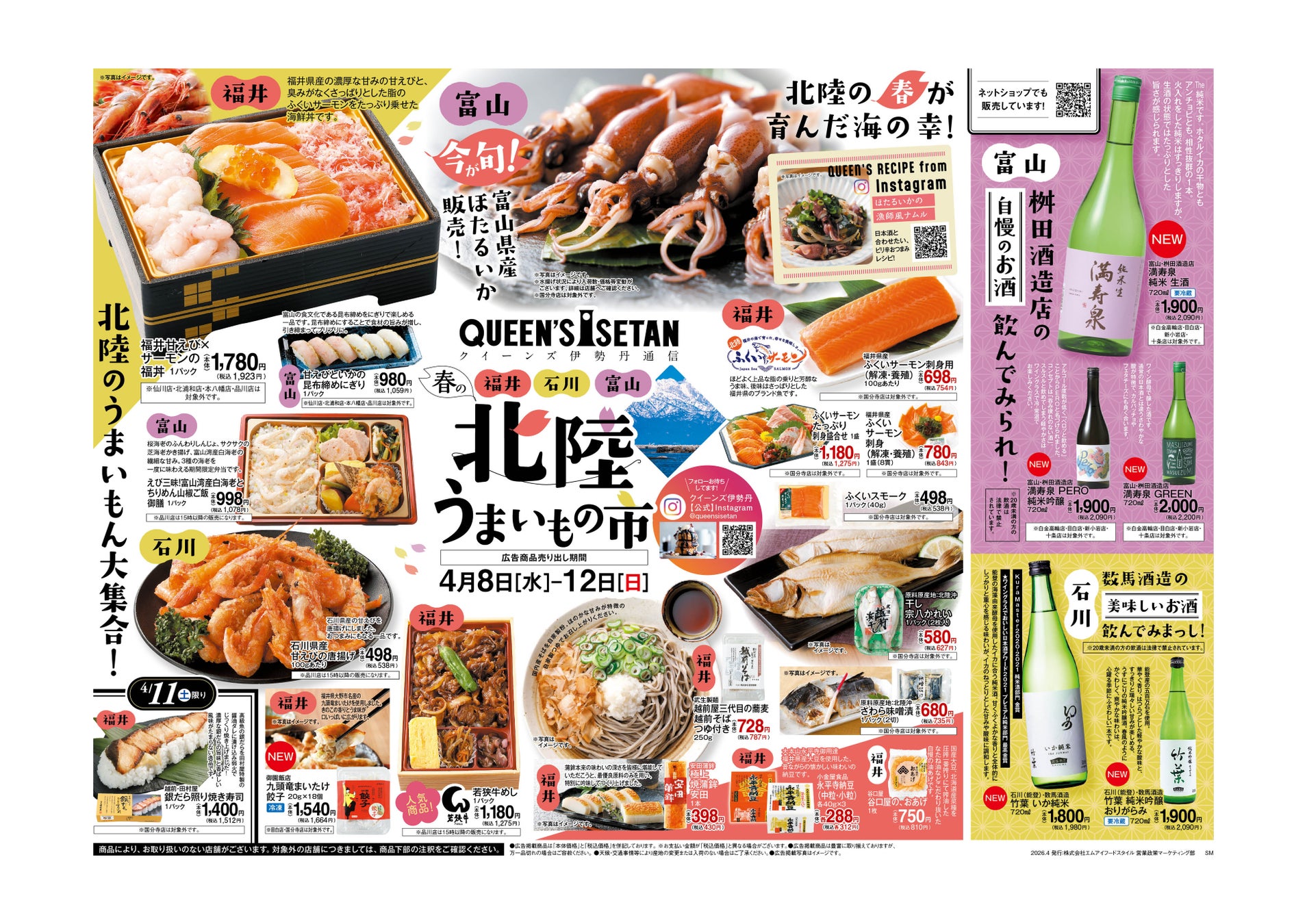 三越伊勢丹のグループ会社で、首都圏を中心に22店舗のスーパーマーケット(クイーンズ伊勢丹)を運営する株式会社エムアイフードスタイル(本社:東京都新宿区、代表取締役社長:雨宮 隆一)は、4月8日(水)~4月12日(日)の期間限定で、「春の北陸うまいもの市」を開催いたします。