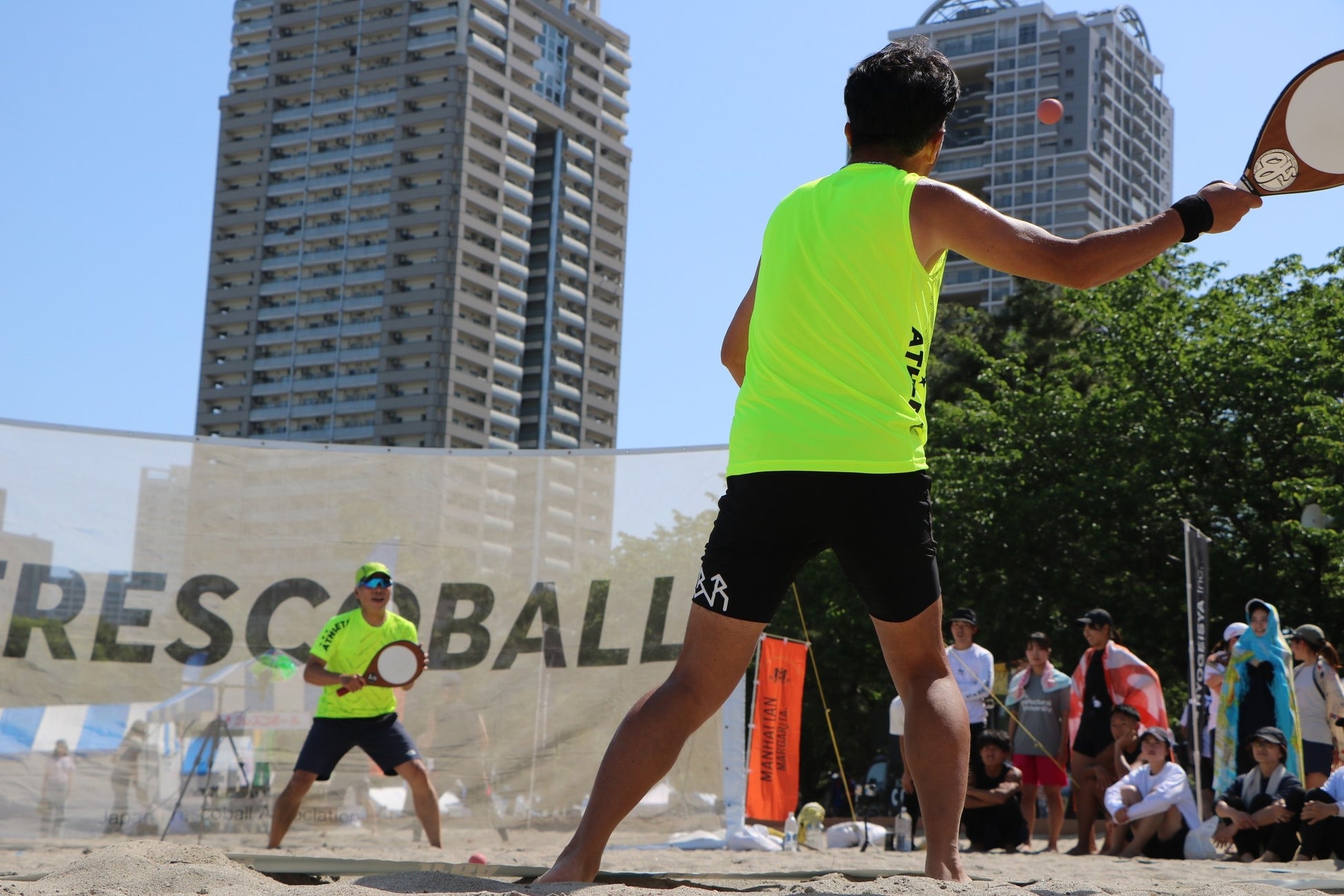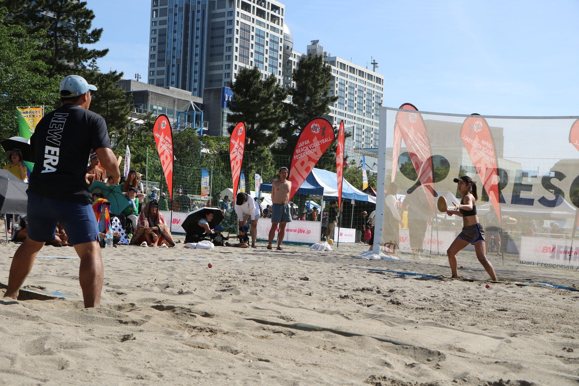 JFBAでは、2018年からおだいばビーチで公式戦を開催。都市型ビーチで大会をできる貴重な機会で、フレスコボール選手なら誰もが憧れる舞台の一つとなっています。今年は、5月3日(土)と4日(日)に公式戦を開催し、5日(月祝)に無料体験会の実施を予定。*5日=大会予備日(荒天等による順延時には公式戦を実施いたします)