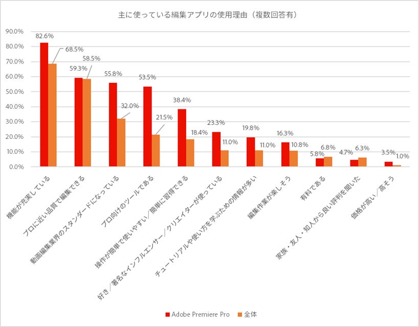 またAdobe Premiere Proを選ぶ理由(複数回答有)としては、82.6%の人が「機能が充実している」を挙げています。これは全体平均 68.5%の 1.2倍高い結果です。次いで「プロに近い品質で編集できる(59.3%)」、「動画編集業界のスタンダードになっている(55.8%)」、「プロ向けのツールである(53.5%)」という回答がありました。特に、平均の回答と比べ、「機能」「業界のスタンダード」「プロ向けのツール」「操作が簡単で使いやすい」「チュートリアルや使い方を学ぶための情報が多い」の項目で平均より高い回答が得られました。