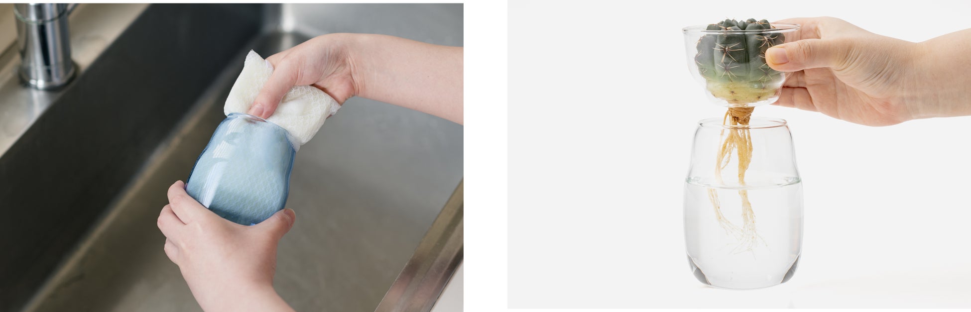 本商品は、企画・開発担当のデザイナーが、日々植物を飾る際に感じていた、【水換えが面倒、一輪挿しは洗いにくい、冬は冷たい水がつらい、植物ごとに専用の花瓶が必要】などの課題に着目し、『簡単に植物を楽しめ、使い勝手の良いフラワーベース』を目指し、開発しました。