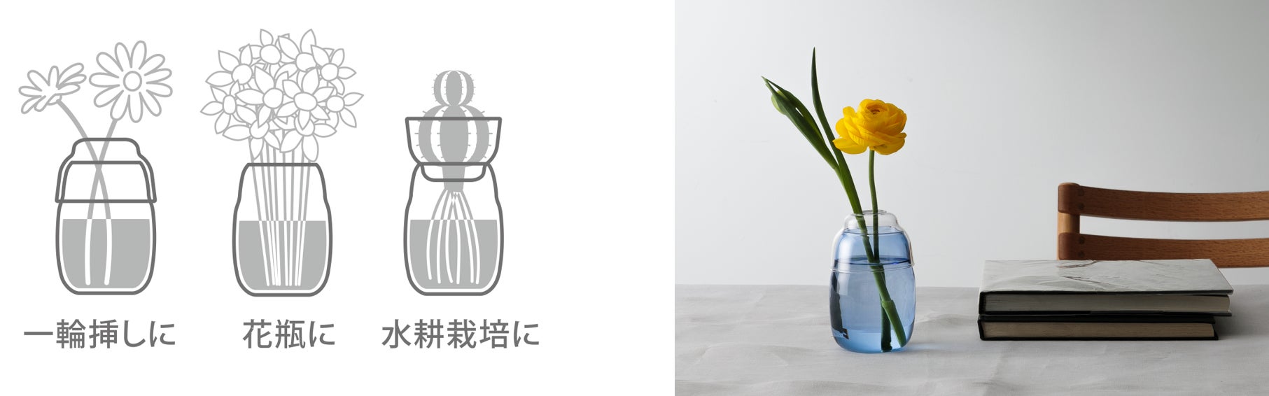 フタの使い方によって 【一輪挿し、 花瓶、 水耕栽培】 の3WAYで使用でき、年間を通して季節の色々な植物を楽しむことができます。コンパクトな丸みのある可愛い形状の本体は、口が広くお手入れが簡単で、水の濁りや茎の状態を確認しやすく、初心者の方でも使いやすいデザインになっています。