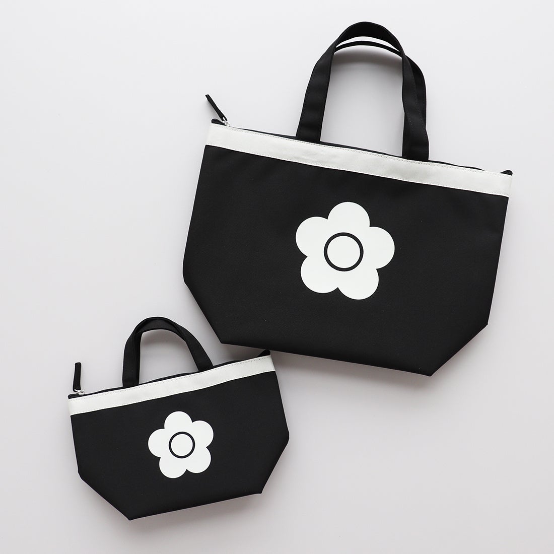 中央の“デイジー”をポイントにブラックとホワイトのバイカラーのシンプルなデザインに仕上げました。ミニバッグはお惣菜やデザートなどを、少量だけ持ち歩きたい時に便利なサイズです。内側のメッシュのポケットには、保冷剤やウェットティッシュなどを入れてお使いいただけます。