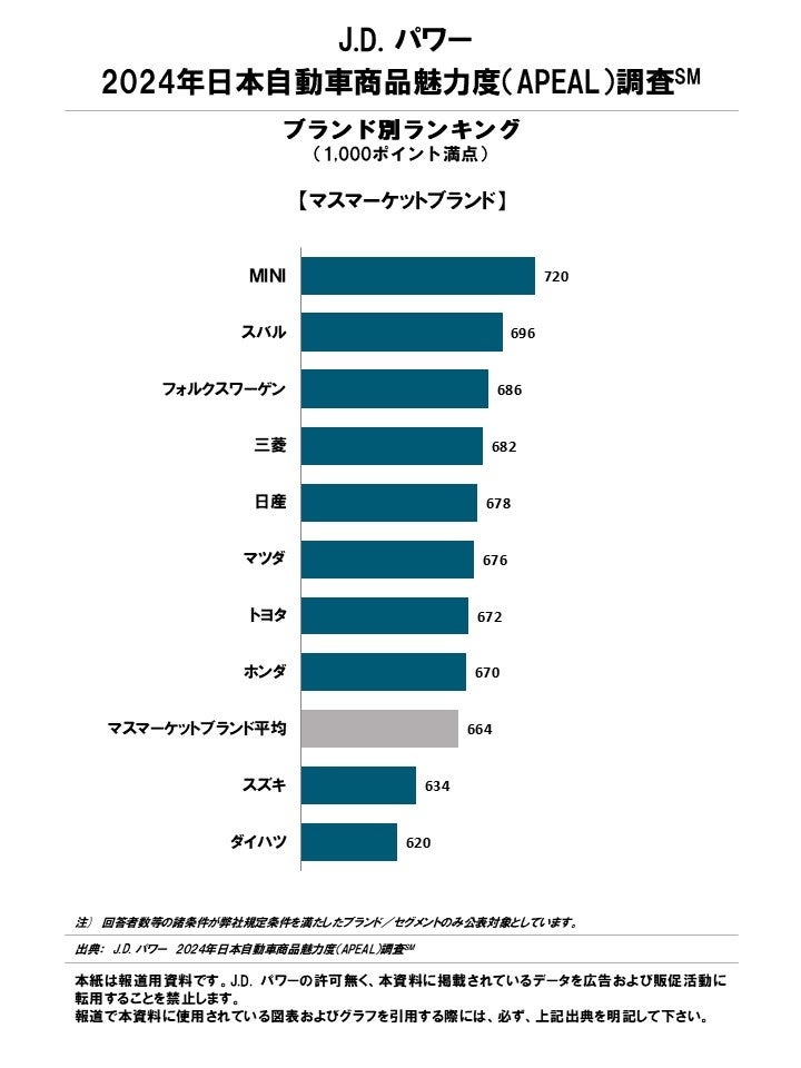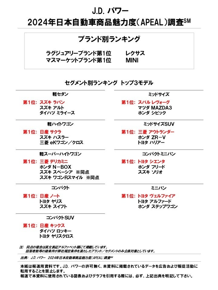 CS(顧客満足度)に関する調査・コンサルティングの国際的な専門機関である株式会社J.D. パワー ジャパン(本社:東京都港区、代表取締役社長:山本浩二、略称:J.D. パワー)は、J.D. パワー 2024年日本自動車商品魅力度(Automotive Performance, Execution and Layout、略称APEAL)調査℠の結果を発表した。