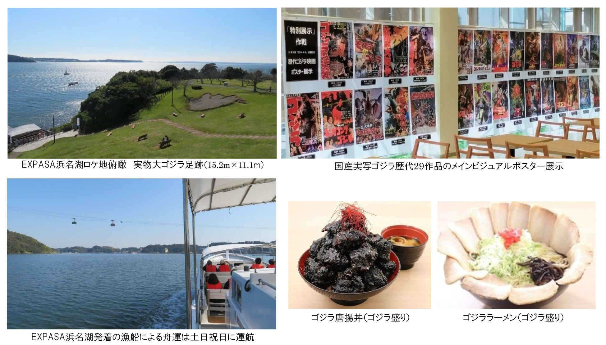 EXPASA浜名湖内ロケ地俯瞰スポットへの実物大足跡展示(15.2m×11.1m)、劇中衣装展示、国産実写ゴジラ歴代29作品ポスター展示、作品PR動画放映、ロケ地クルージング(11月末日までの土日祝運航。悪天候時欠航)、コラボメニュー(11月末日まで。ゴジララーメン、ゴジラ唐揚丼)、コラボ土産販売等