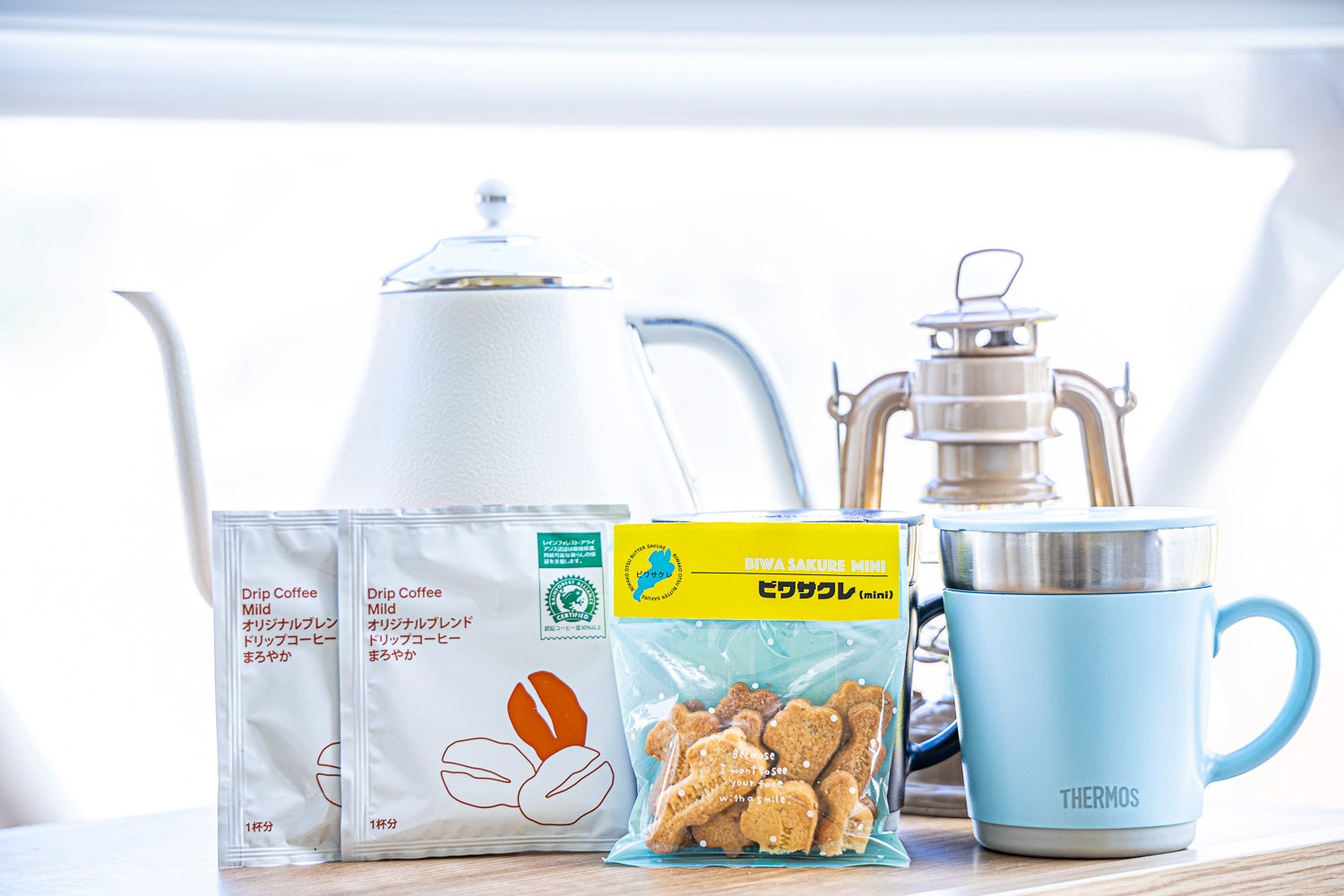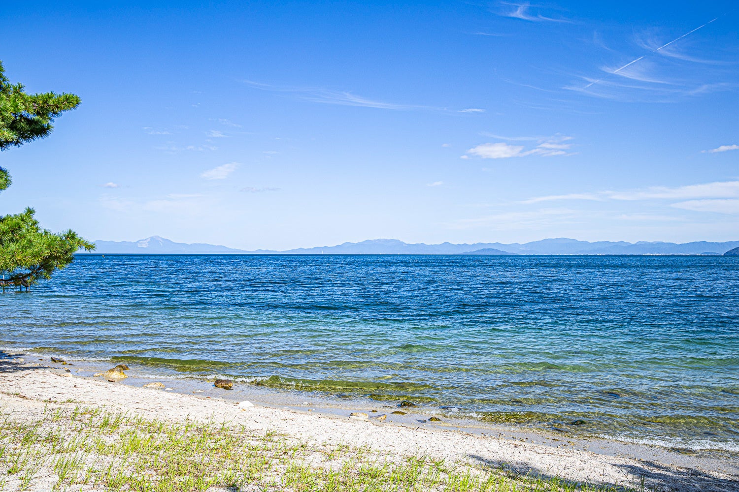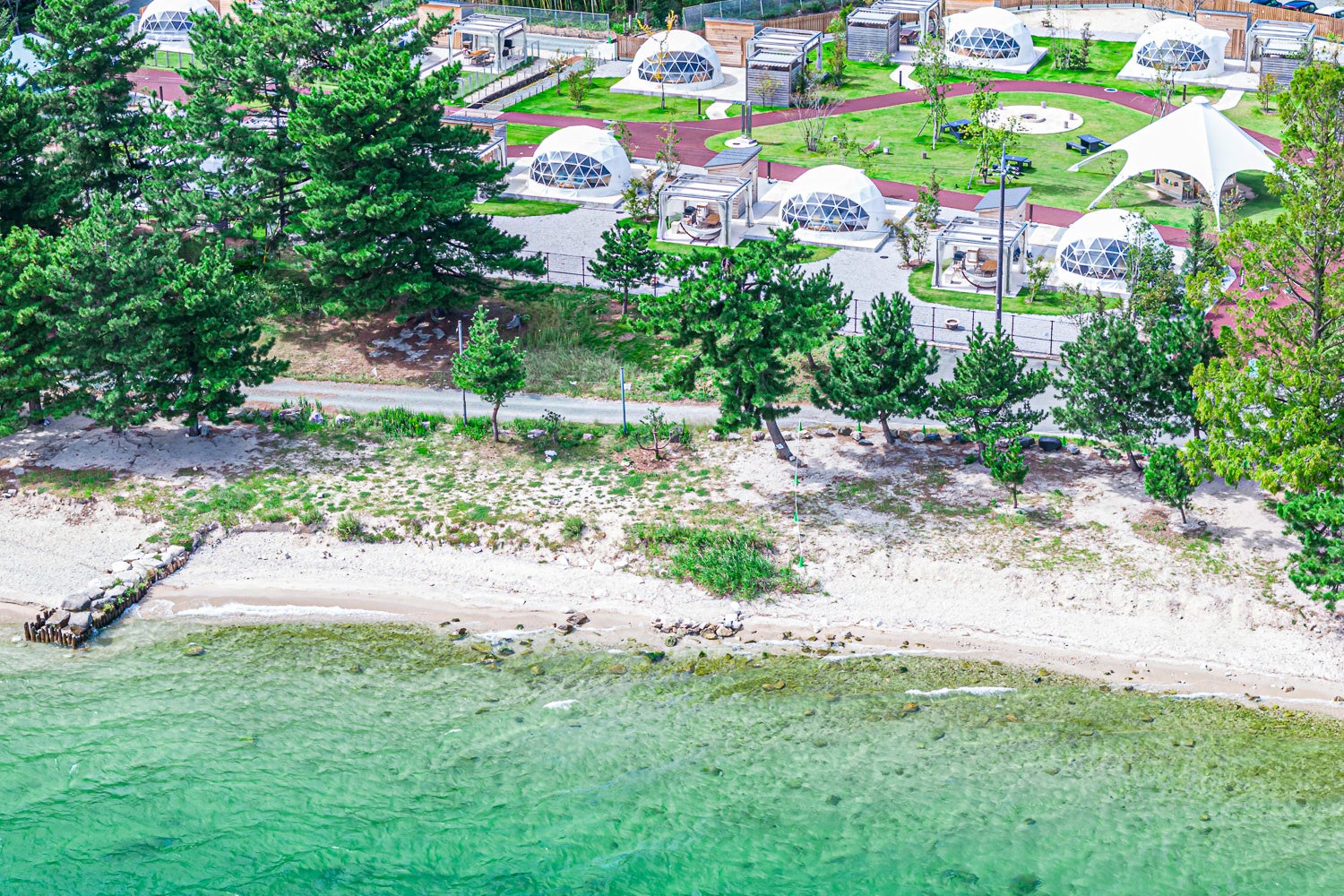 目の前には琵琶湖が広がり、砂浜まで10歩。振り向けば比良山系の山並みを望む、四季折々の美しい自然に囲まれ、調和する12棟のグランピングリゾートです。