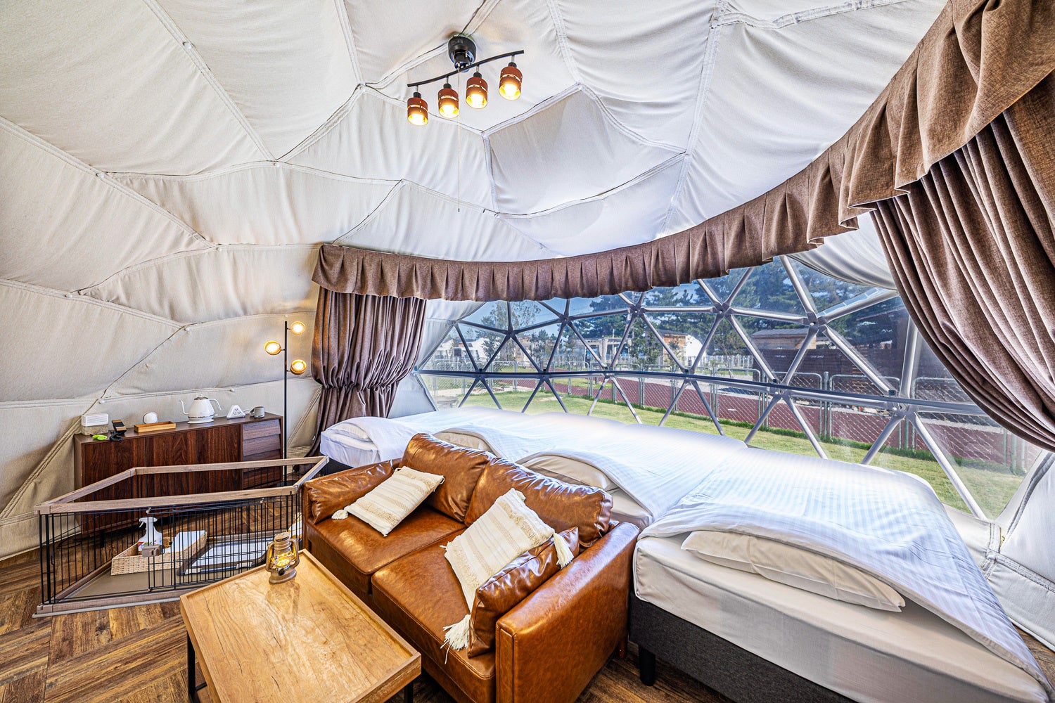 ペットと一緒に宿泊できる直径6mのドーム型テント、テント内にはシングルベッドを4台配置しており、4名まで宿泊が可能なお部屋です。