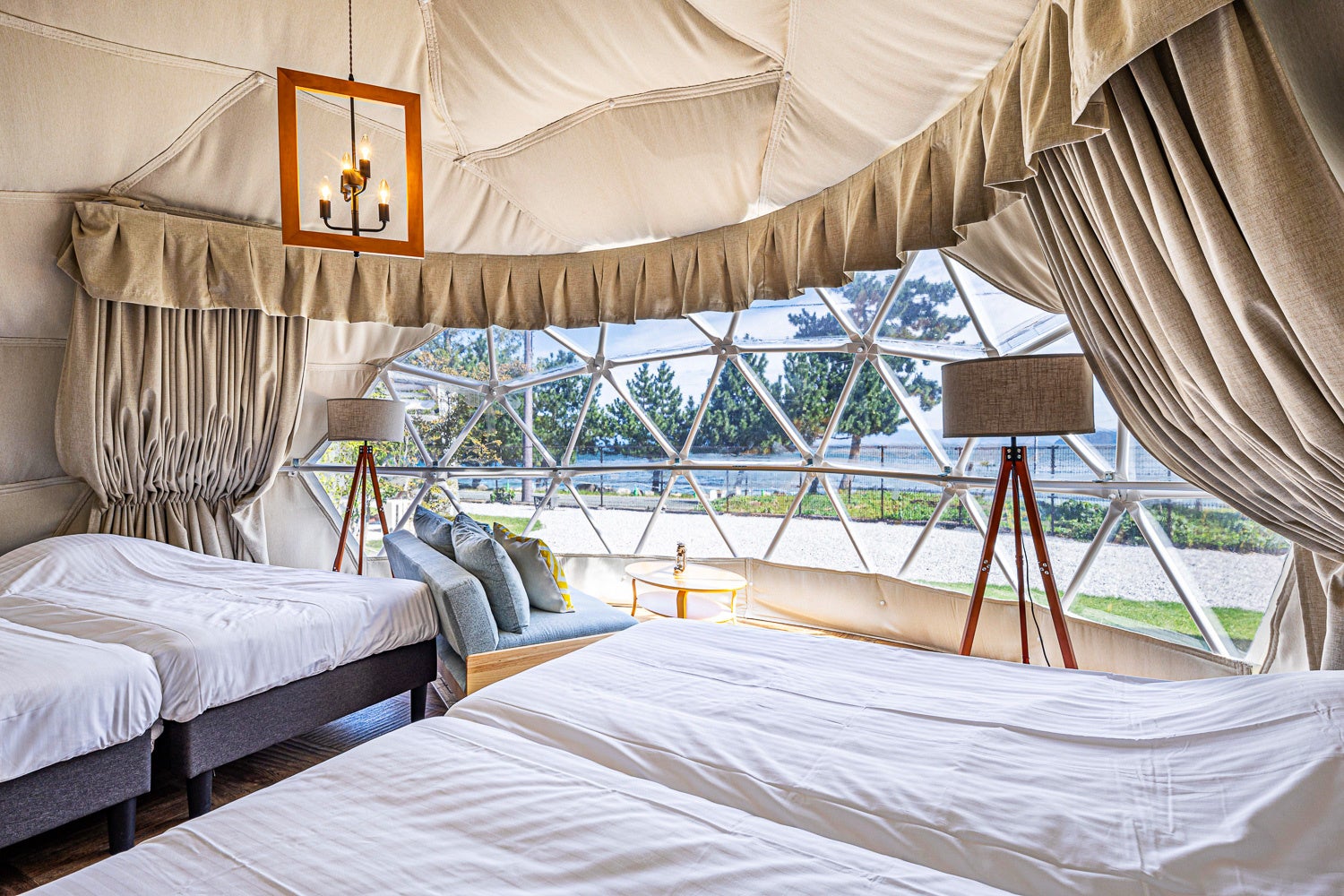 琵琶湖を望むレイクビューの直径6mのドーム型テント、テント内にはシングルベッドを4台配置しており、4名まで宿泊が可能なお部屋です。
