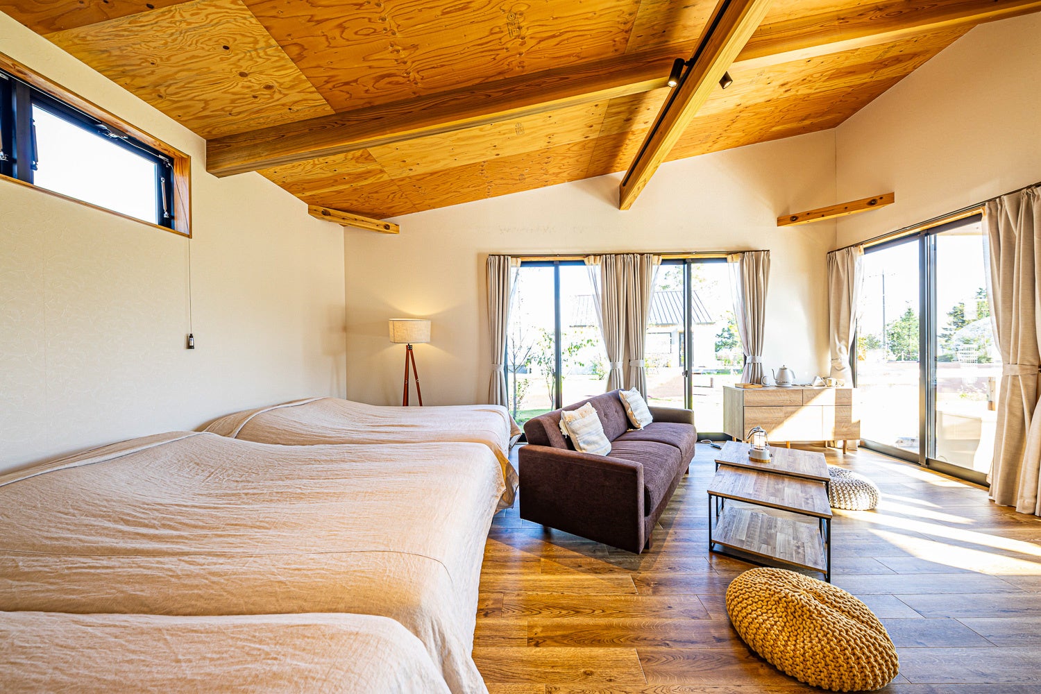 施設最大の1棟限定のラグジュアリールーム、ダブルベッドを3台配置しており、6名まで宿泊が可能なお部屋です。
