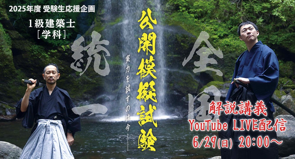学科II(環境・設備)と学科IV(構造)は、模擬試験内で特に重要とされる問題、2025年4月1日施行の法改正が関連する問題および合格者と不合格者で大きく差がつく問題についての「解説講義」を、2025年6月29日の模擬試験当日にYouTube LIVE配信でお届けいたします。