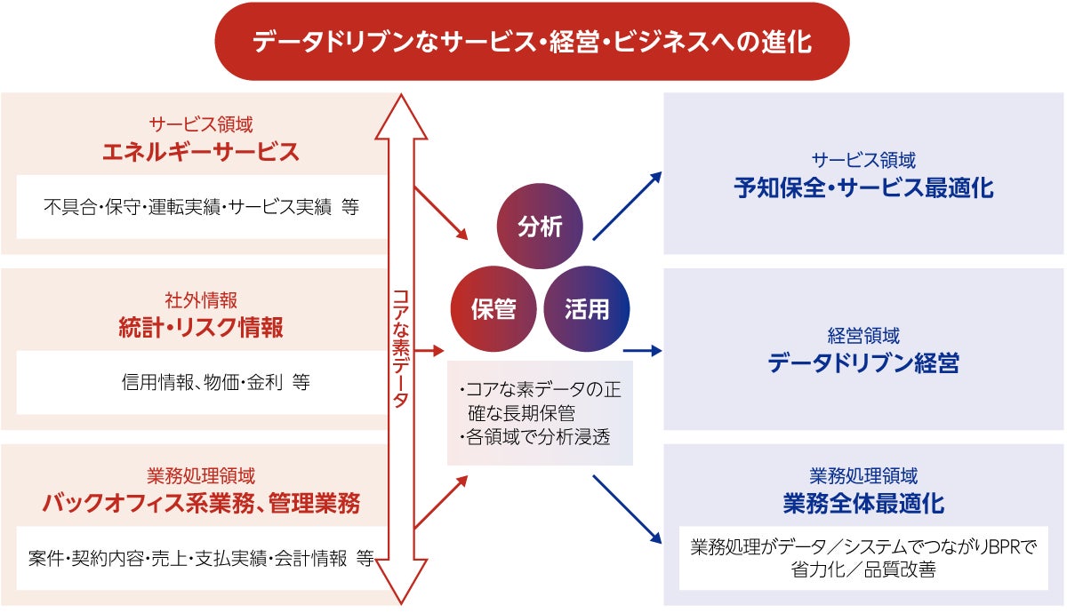 総合エネルギーサービス事業で成長を続けるJFSは、2023年に全社データ活用構想を策定し、長期保管されたデータを活用した予知保全やサービス最適化、データドリブン経営の実現を目指していました。しかし、データは複数システムに分散し、設備ごとの仕様の違いも大きく、既存の他社BIツールではデータの収集自体が困難な状況でした。さらにExcel中心の業務が定着していたことで、データ収集は属人化し、手作業による加工の工数も増大し、過去・現在、将来のデータを横断した分析も難しい状況でした。特にデータの収集については、マスタのデータ項目やフォーマットが多様で、同じマスタでもシステムリプレースなどによりデータ項目が変わるため、蓄積データの情報の連続性が保てず、案件情報の長期保存が課題でした。