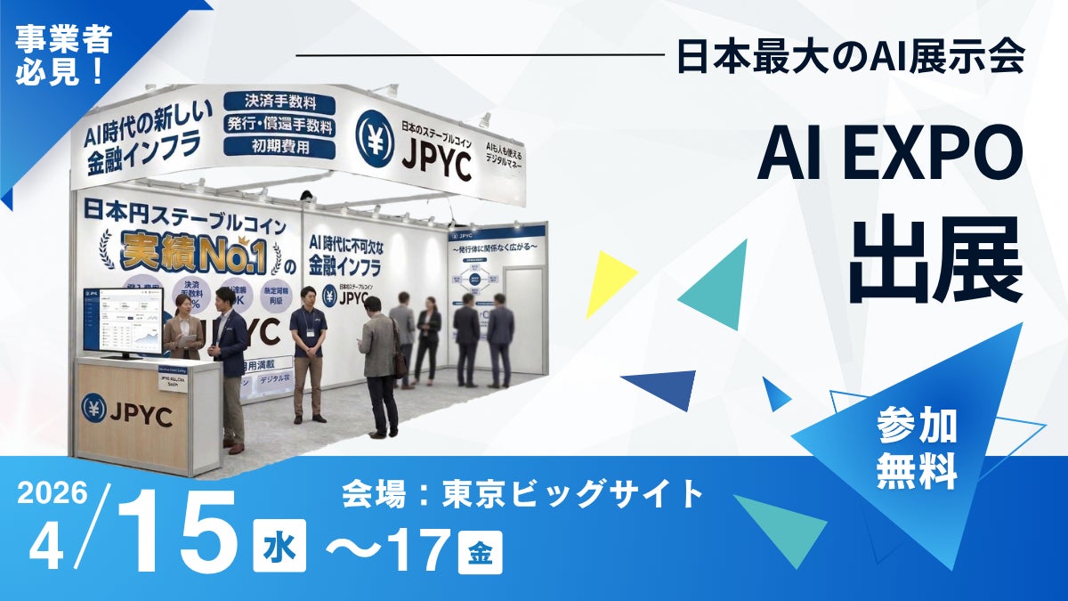 日本円ステーブルコイン「JPYC」を取り扱うJPYC株式会社(東京都千代田区、代表取締役:岡部 典孝)は、2026年4月15日から3日間、東京ビッグサイトで開催される「Nextech Week 2026 ~ 第10回 AI・人工知能 EXPO [春] ~」に出展することをお知らせします。