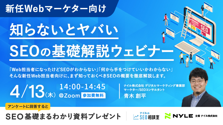 マーケティングDX事業を営むナイル株式会社(本社:東京都品川区、代表取締役:高橋 飛翔、以下、ナイル)は、新任WebマーケターやSEO初心者へ向けて、SEOの基礎から少し役立つ「ChatGPT活用方法」まで解説するウェビナーを、4月13日(木)14:00より無料にて開催します。