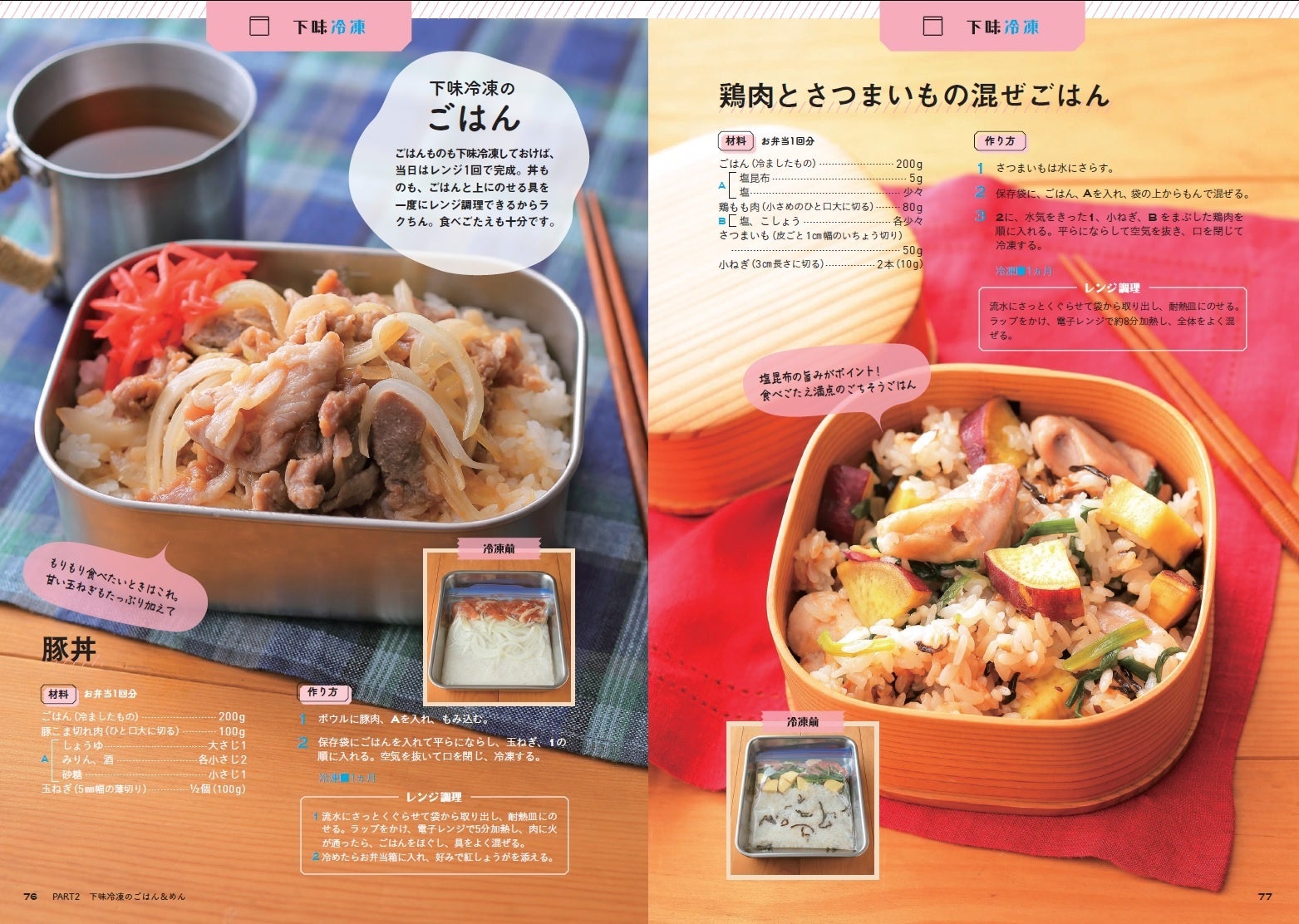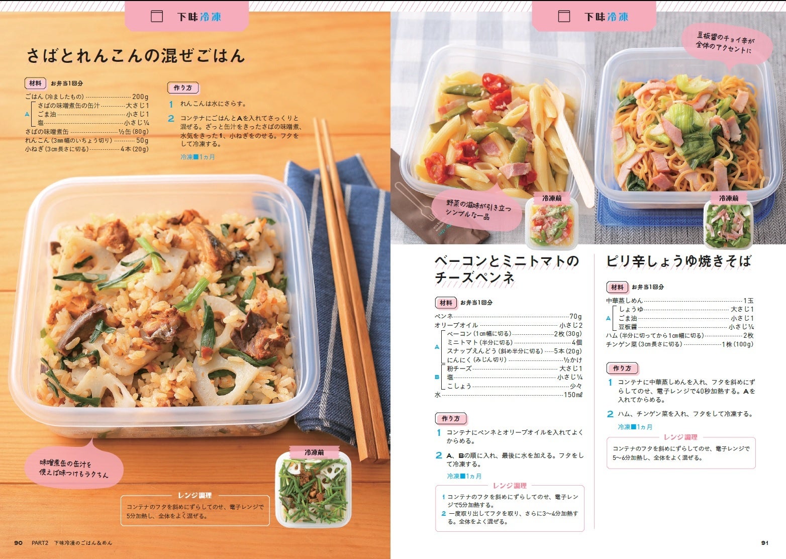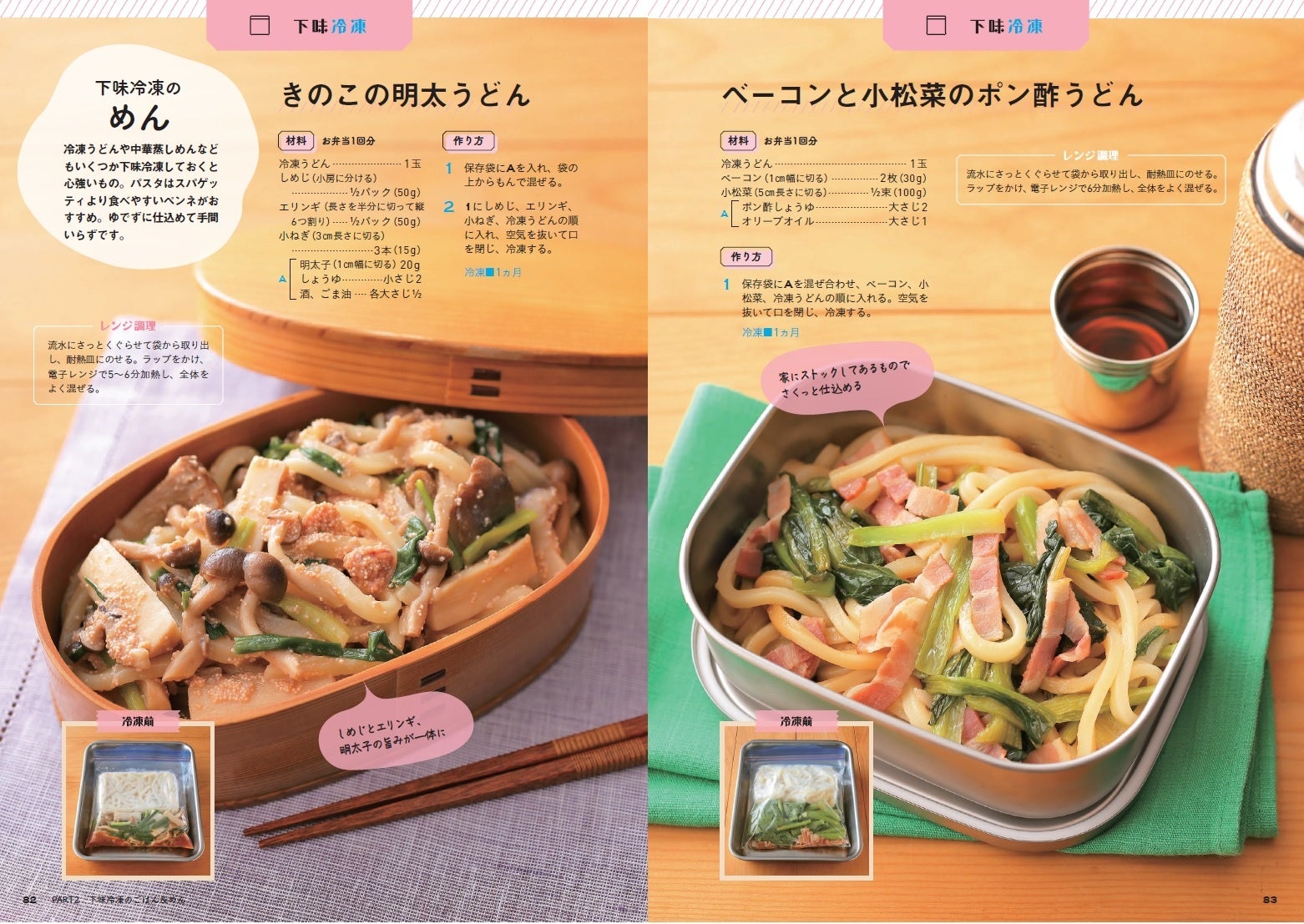そのほか、どんぶり&めん類のレシピも掲載。めんは下茹でなしに冷凍できるので準備もラク。1品でもお弁当が完成するので、時間がないときには特に大活躍してくれます。