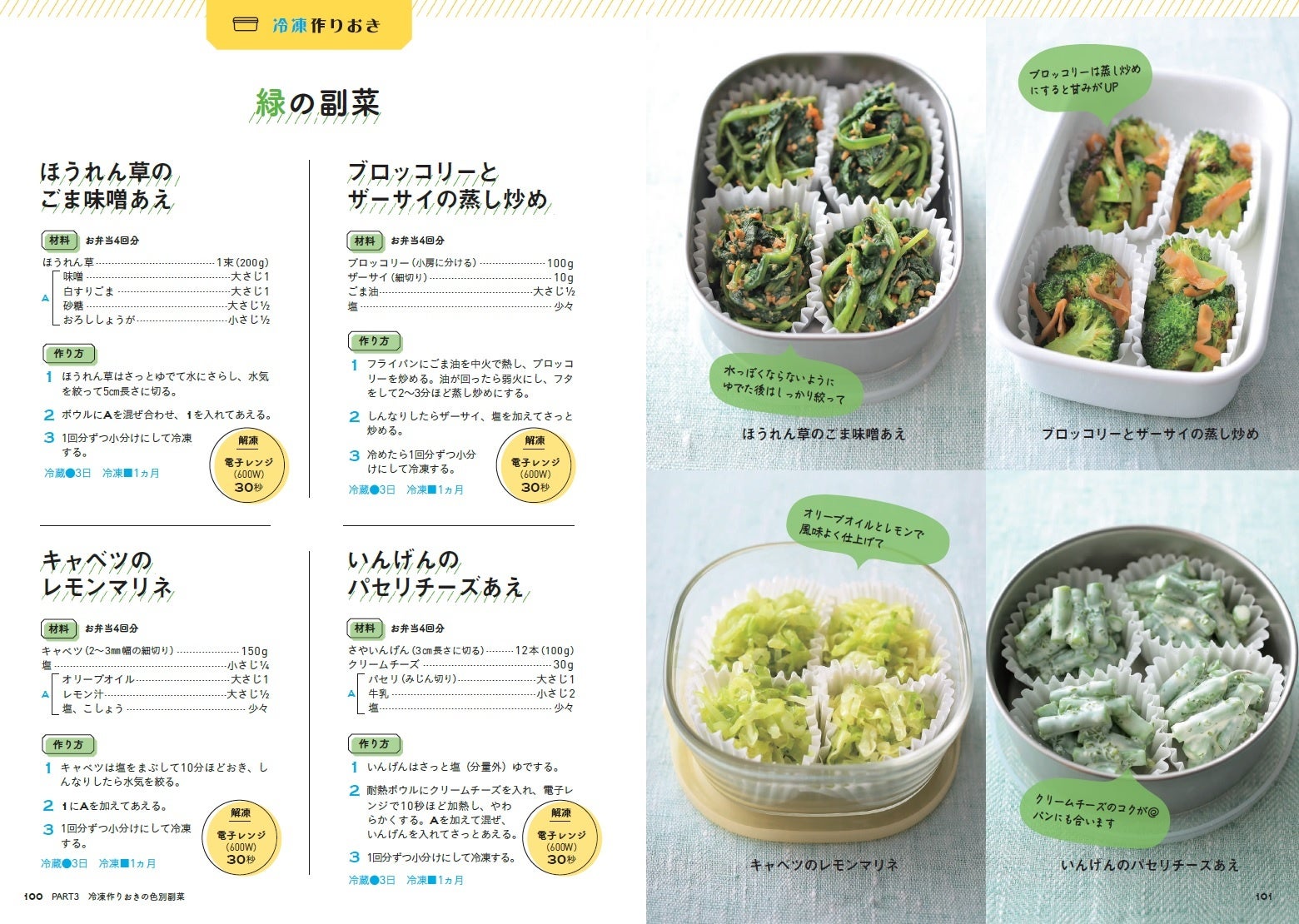 そんな2種類の作りおきおかずを活用すれば、朝はレンチンほったらかしでお弁当が完成!おかずは材料順に並んでいるので、冷蔵庫にあるものでできるおかずがすぐに見つかります。