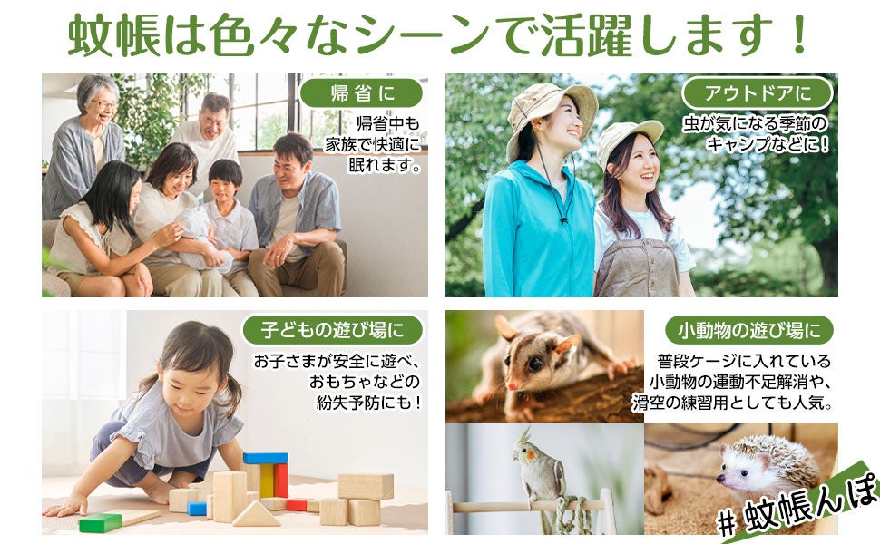 マットレスに固定できる専用ゴムを搭載しており、寝返りを打っても蚊帳がズレることなく、朝まで深い眠りをサポートします。サイズはシングルからファミリーで使えるダブルまで4サイズを展開。近年では、ペットや小動物の安全な遊び場「蚊帳んぽ」用としても、SNSを中心に大きな話題を集めています。