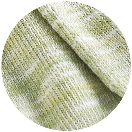 お肌に優しい素材、綿と絹で作りました。肌側は絹、表側は綿の層になるように編立をし、冷え予防にもおすすめです。