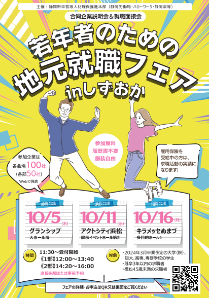 静岡新卒者等人材確保推進本部(静岡労働局、ハローワーク、静岡県等)は、2024年3月卒業予定の大学生等、既卒3年以内の方及び概ね45歳未満の方を対象として、静岡県内に就業地のある約300社の企業と直接会うことができる対面形式の合同企業説明会・就職面接会を開催いたします。