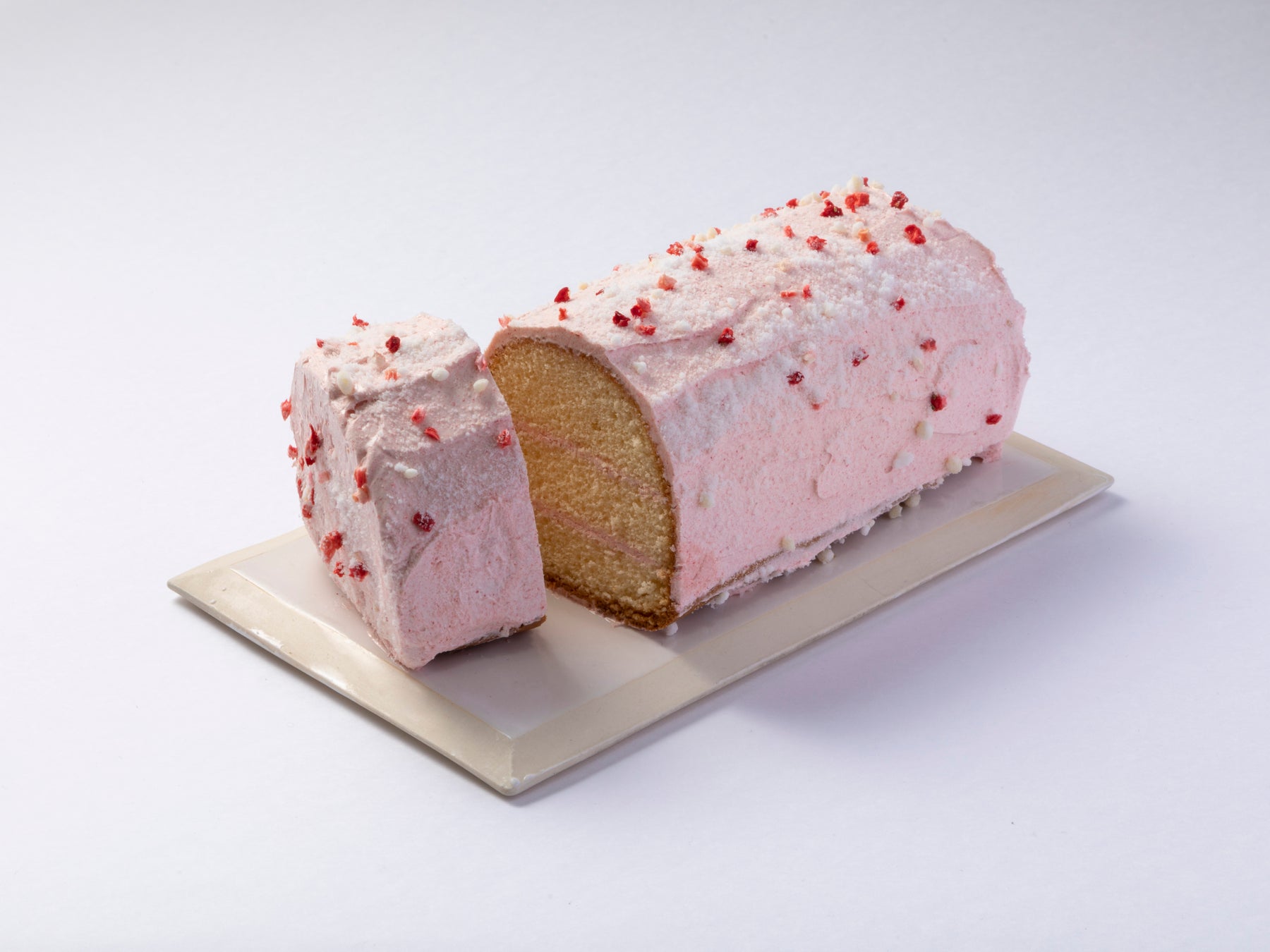 きめ細かいバタースポンジを甘酸っぱいストロベリーバタークリームでコーティング。天面に散らしたフリーズドライストロベリーの酸味がアクセントに。