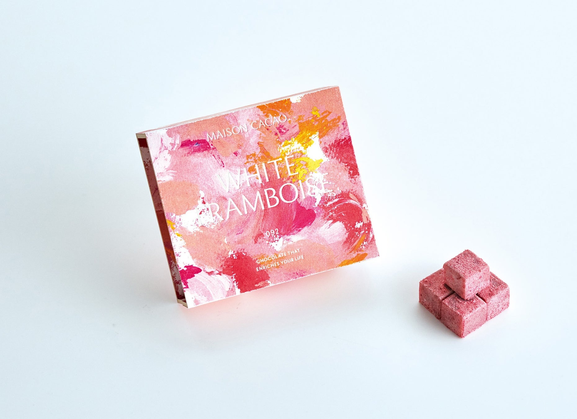 お花のような華やかな香りと優しい甘さの口溶けのよいホワイトチョコレートに、あまずっぱいフランボワーズを合わせた一品です。北海道帯広の山間で育てられる国産フランボワーズは、味がギュッと詰まって濃厚なあまずっぱさと香りを持ちます。華やかに広がる味わいを紅茶やお酒とともに、お楽しみください。