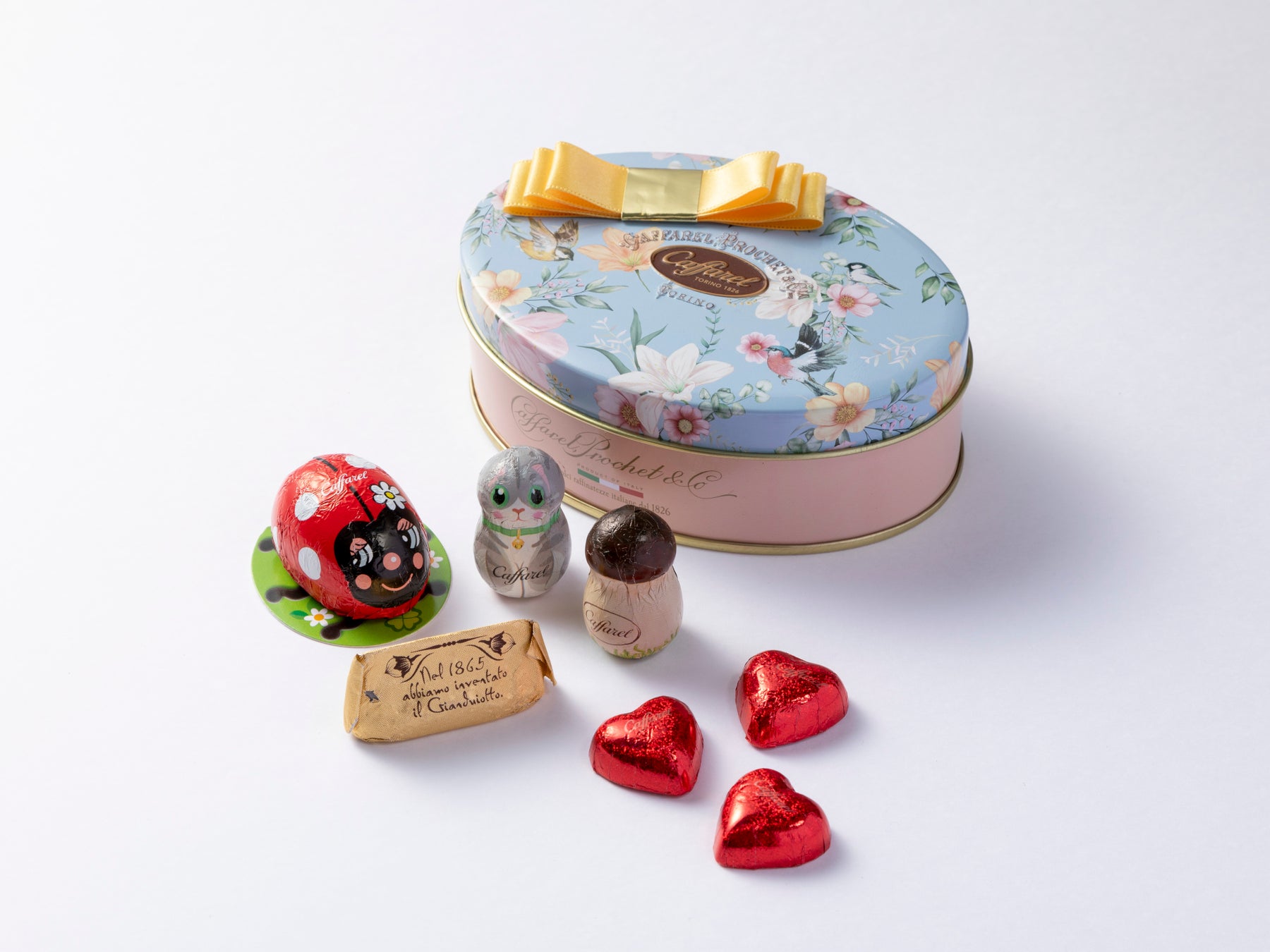 小鳥と花が描かれたオーバル缶に、カファレルの代名詞であるジャンドゥーヤやかわいい表情のてんとう虫のホイルチョコレートなど全7粒をアソートしました。淡いブルーを基調とした落ち着いたデザインですので、ギフトとしても贈る相手を選びません。