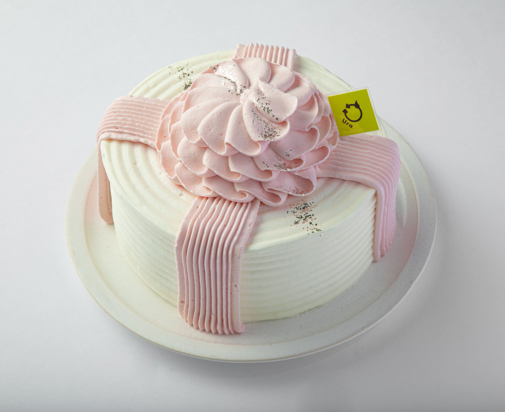 フリルの上に絞ったピンクのクリームはまるでプレゼントBOXのリボンのよう。甘酸っぱい苺クリームをサンドした、大切な人へのプレゼントにピッタリなデコレーションです。