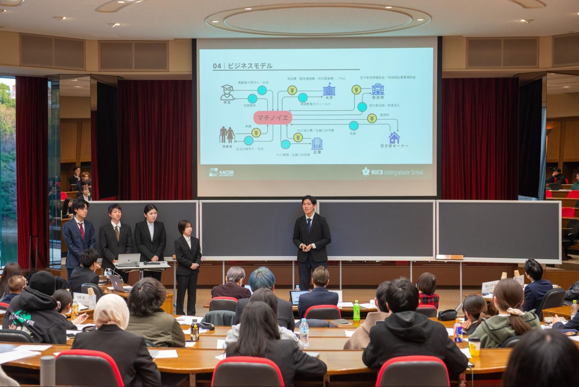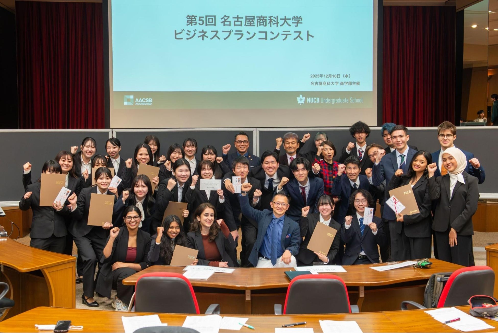 名古屋商科大学商学部主催の「第5回ビジネスプランコンテスト」の最終審査が、2025年12月10日(水)に開催されました。留学生も含む全8チームの熱意あふれるプレゼンテーションが繰り広げられ、聴講学生は、ビジネスプランを実行に移した時に想定される課題や、コストと利益の収支の予測などについて質問し、審査員も実際のビジネスにつなげるための視点から意見を述べ、大いに盛り上がりました。