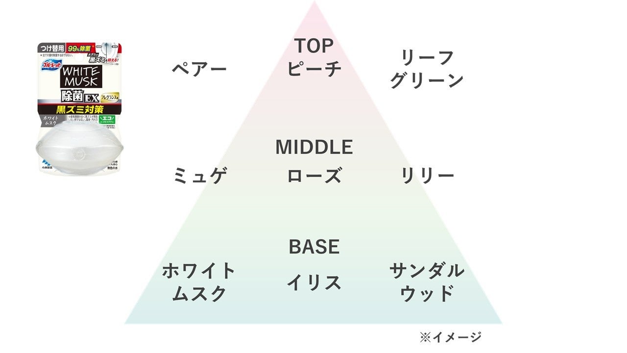 近年では、生活者のトイレに対する意識が大きく変化し、「臭くて汚い空間」から「一人になれるリラックス空間」へと捉えられつつあります。これと並行して、透明感や清潔感のあるピュアで優しい印象のホワイトムスクの香りが人気を集め、今や定番の香りとして定着しています。そこで、人気の高まりを経て定番となったホワイトムスクの香りをトイレでも楽しめる、新たなトイレタリー製品を開発しました。