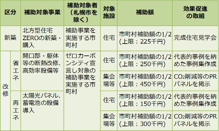 北海道では、2050年の「ゼロカーボン北海道」の実現に向けて、ゼロカーボン北海道推進基金を活用し、北方型住宅ZEROの新築住宅の取得や省エネ改修、太陽光パネル・蓄電池等の設備を導入する際に補助事業を実施する市町村を支援する事業として、令和5年度に「住まいのゼロカーボン化推進事業」を創設しました。