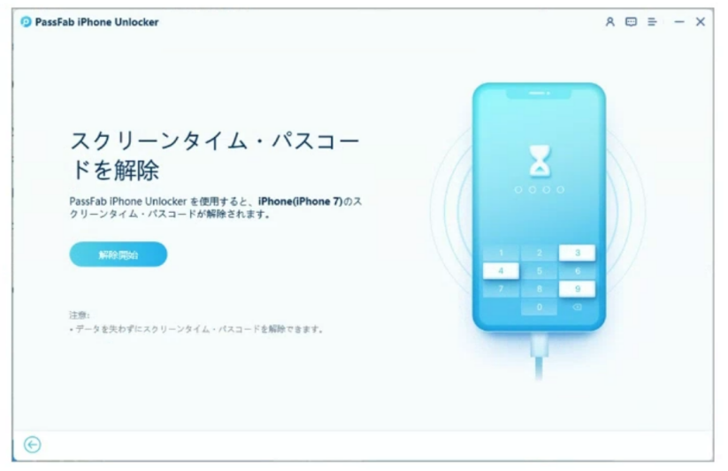 Step1:PassFab iPhone Unlockをパソコンにダウンロードして起動し、「スクリーンタイム・パスコードを解除」をクリックします。