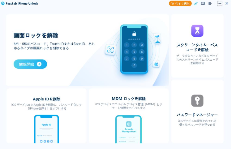 まずご紹介するのはデータを失うことなくiPhone/ iPadのスクリーンタイムを解除するソフトPassFab iPhone Unlockを使用し、画面のガイダンスに沿って、数ステップで簡単、高速にiPhone/ iPadのスクリーンタイムを解除する方法です。PassFab iPhone UnlockはiPhone/ iPadのスクリーンタイムパスワードの解除、画面ロックの解除、Apple IDの削除、MDMロックのバイパスなどの機能を備えた専門ツールです。また、 iOS16/iOS15などすべてのiOSバージョンとデバイスに対応(iOS17 Betaにも対応)できます。それでは、PassFab iPhone Unlockでスクリーンタイム・パスコードを解除する方法を見ていきましょう。