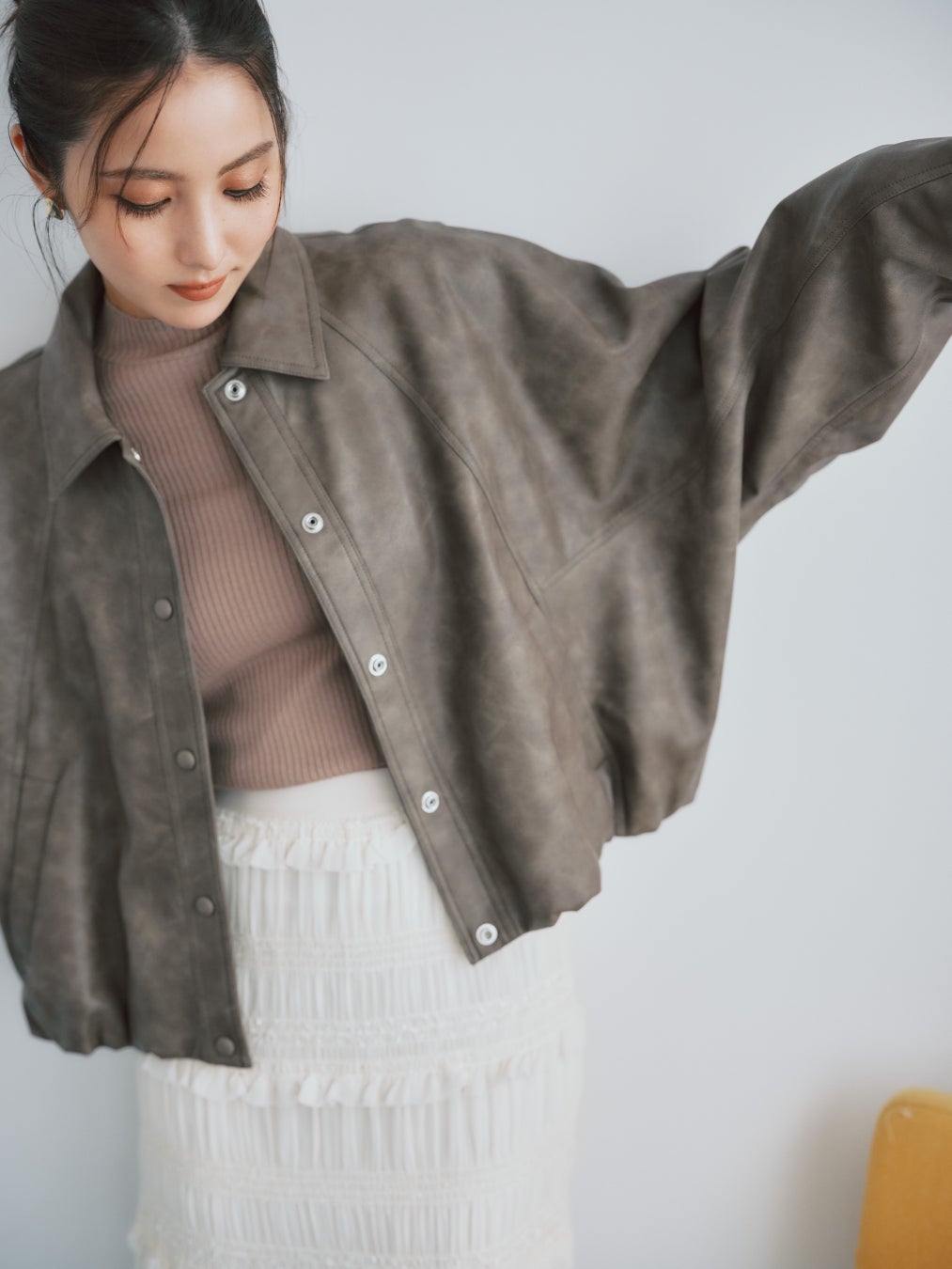 ショート丈&ドルマンスリーブ、コンパクトなフォルム。これさえあれば旬のコーディネートが完成するレザーブルゾン。チュールやレースなど映えスカートと合わせて、フェミニニティを香らせて。